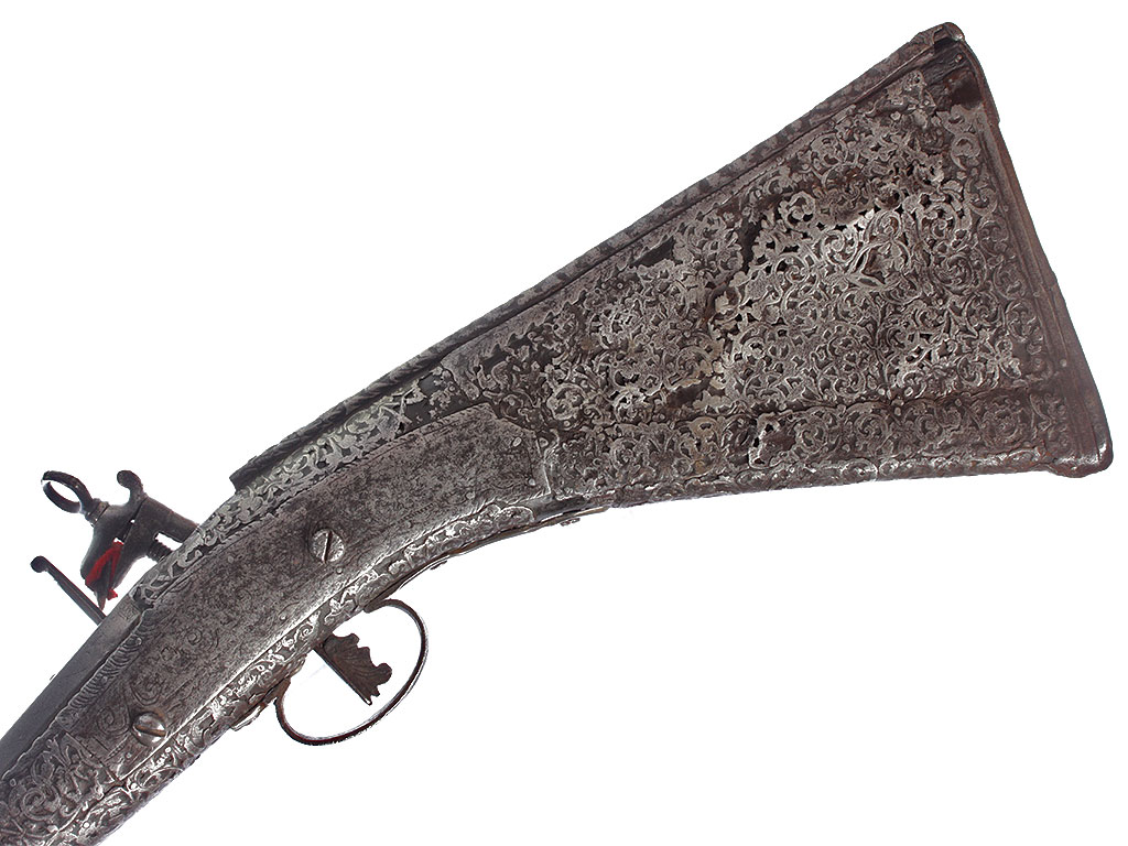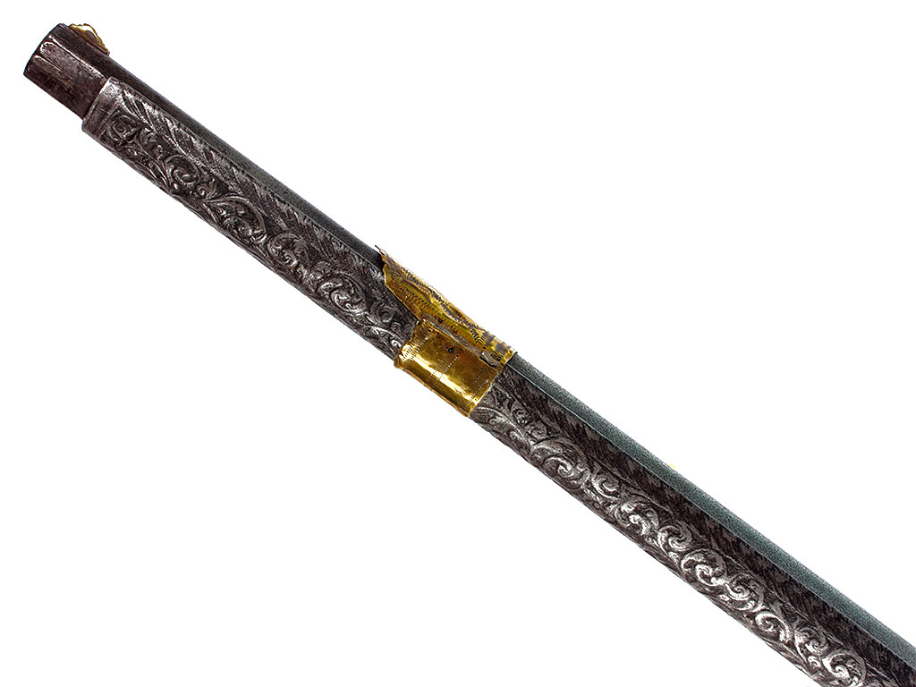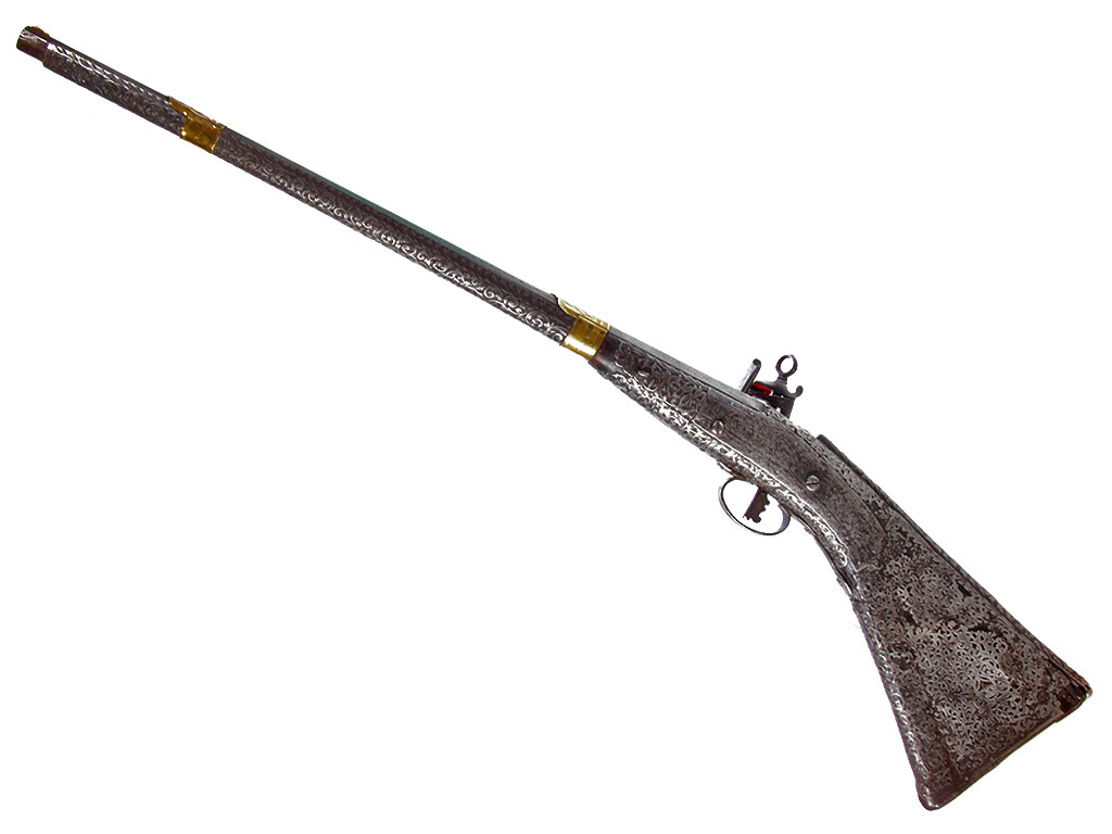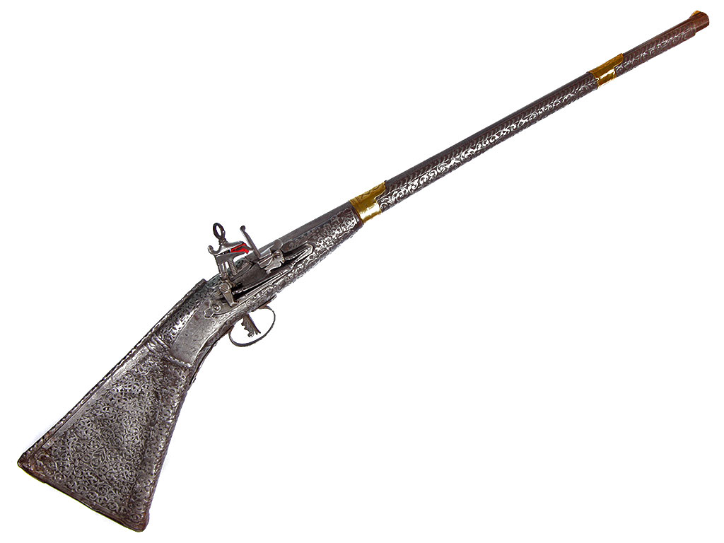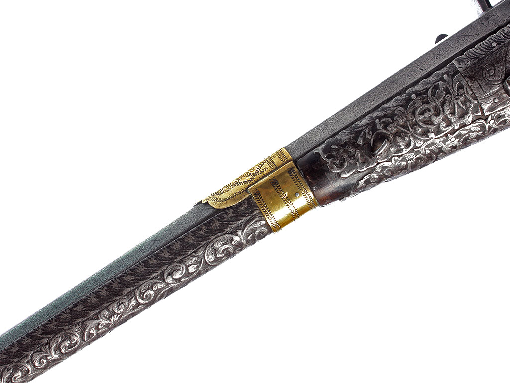 Ружье с кремневым замком, изготовленное в начале - первой половине XIX века. Ствол граненый, ничем не украшен. Кремневый замок турецкого типа, без клейм. Приклад и ложа полностью покрыты металлическим листом, украшенным объемным гравированным растительным орнаментом. Вероятнее всего, представленный образец бытовал на территории Османской империи, возможно, в Балканском регионе.