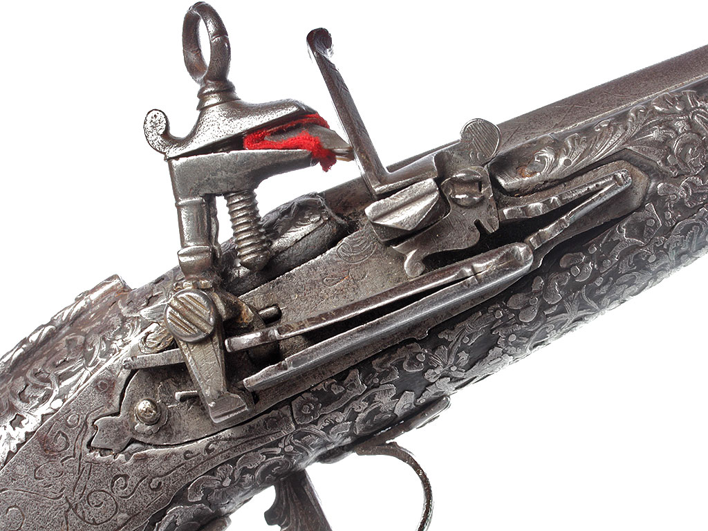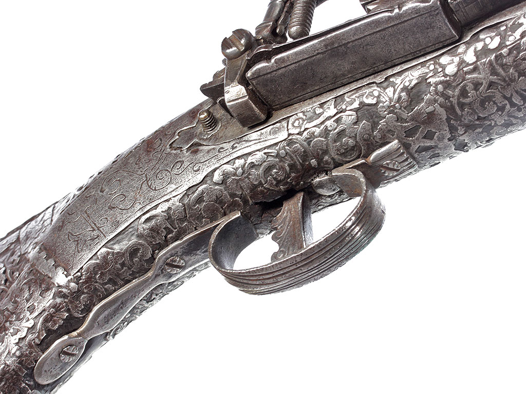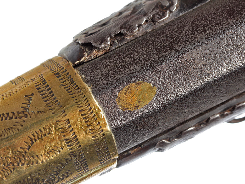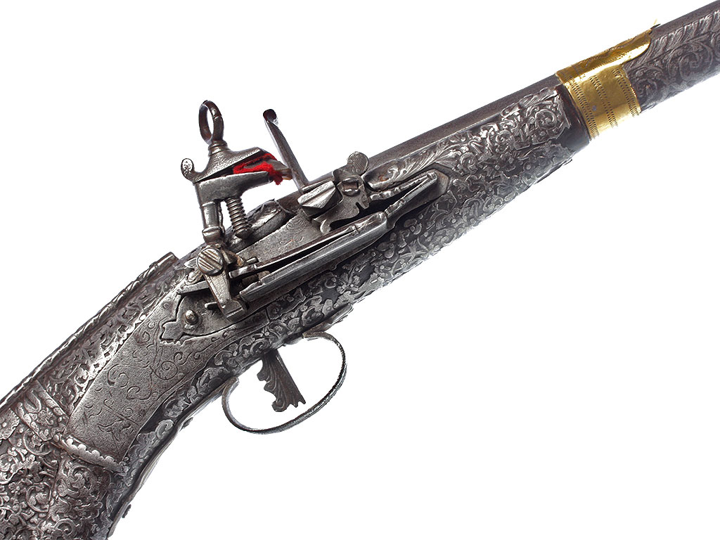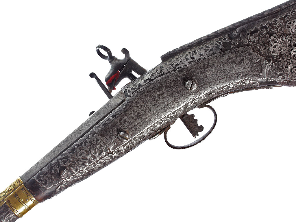 Ружье с кремневым замком, изготовленное в начале - первой половине XIX века. Ствол граненый, ничем не украшен. Кремневый замок турецкого типа, без клейм. Приклад и ложа полностью покрыты металлическим листом, украшенным объемным гравированным растительным орнаментом. Вероятнее всего, представленный образец бытовал на территории Османской империи, возможно, в Балканском регионе.