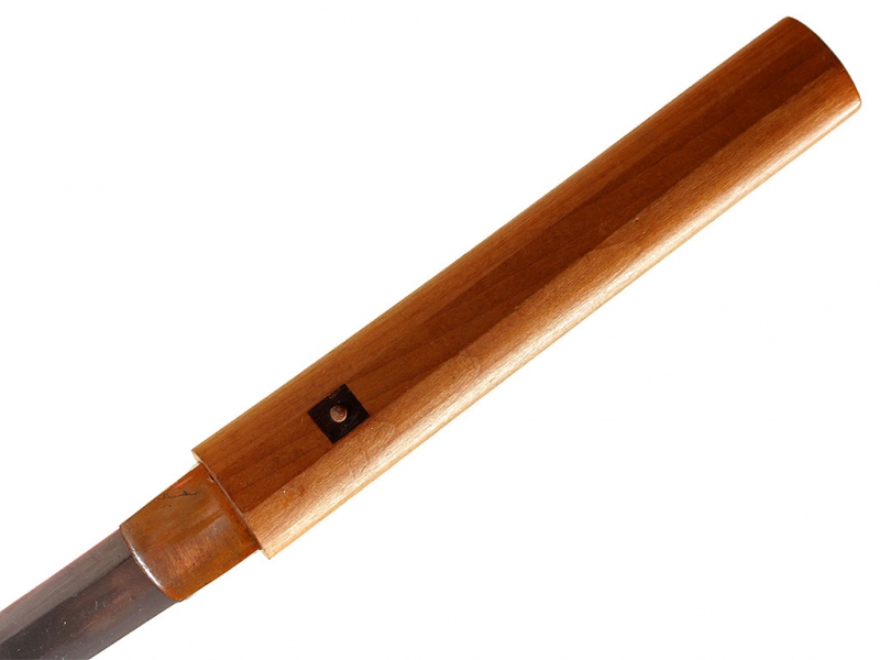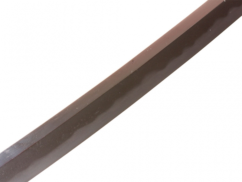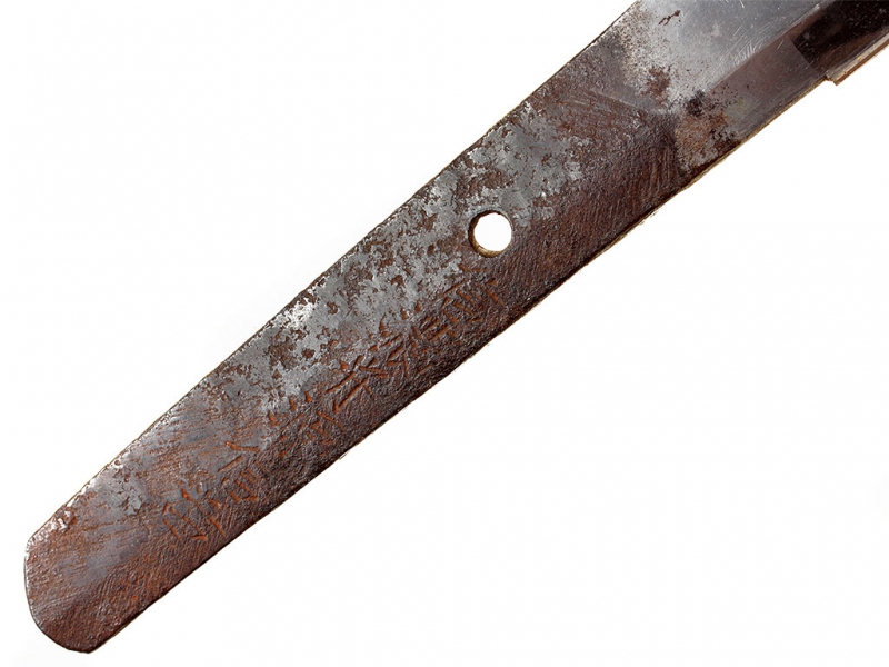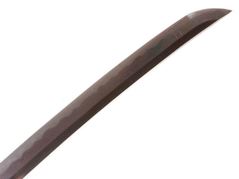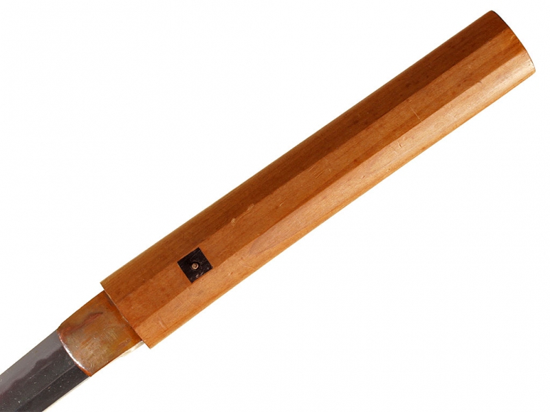 Большой самурайский меч катана, изготовленный в середине периода Эдо. Клинок с хорошо различимой, слегка волнистой линией закалки, напоминающей облака. Хвостовик подписан мастером, имеет одно крепежное отверстие. Муфта хабаки медная гладкая. Клинок помещен в сира-сайя для хранения.