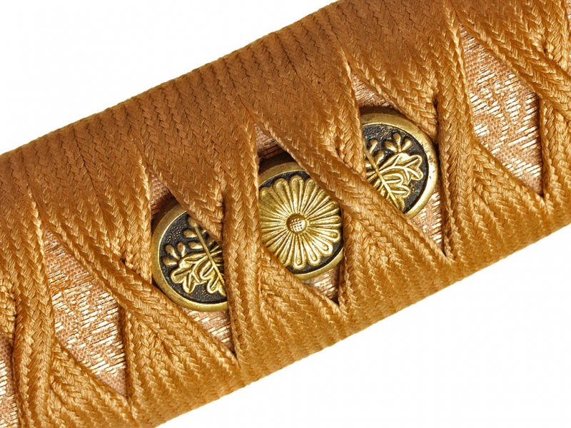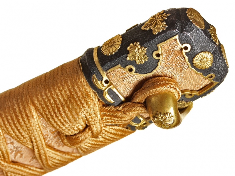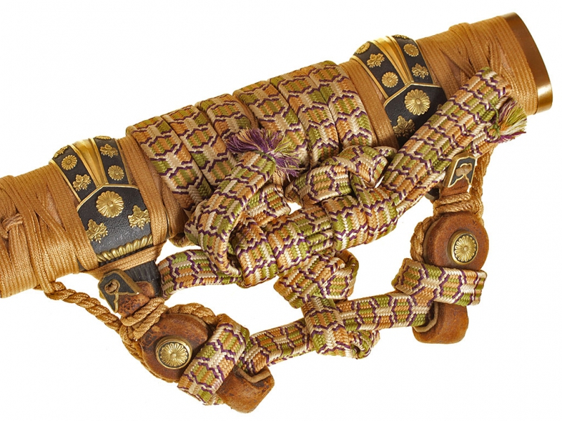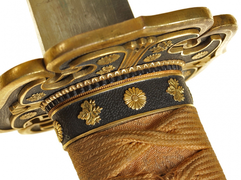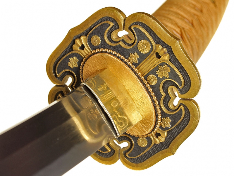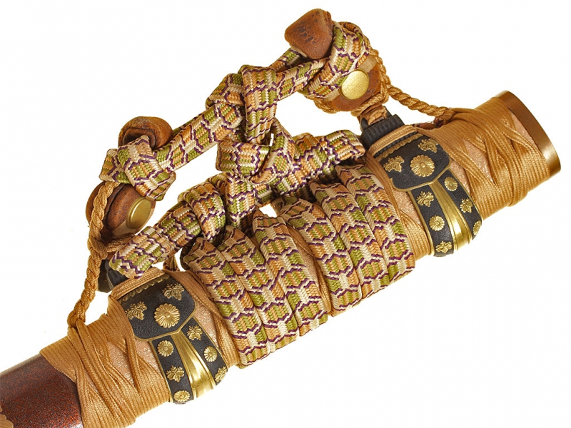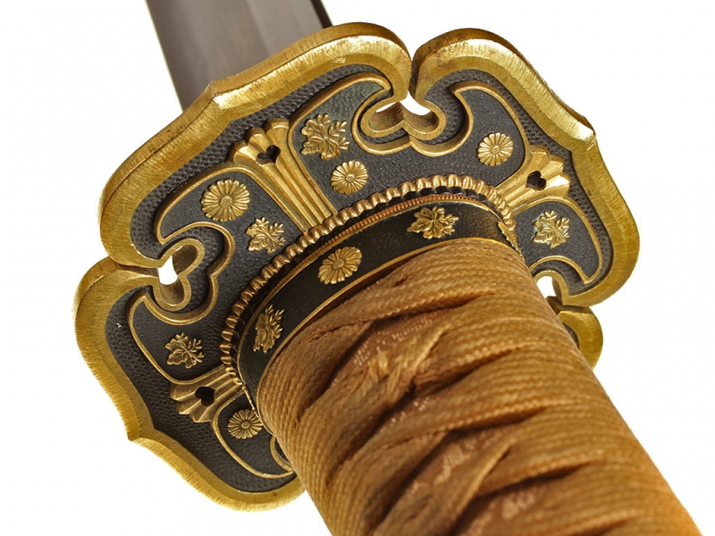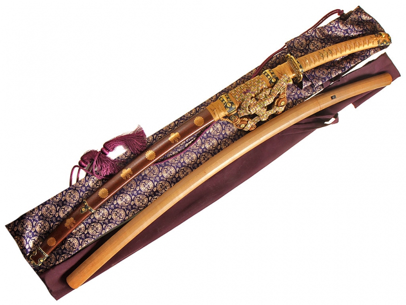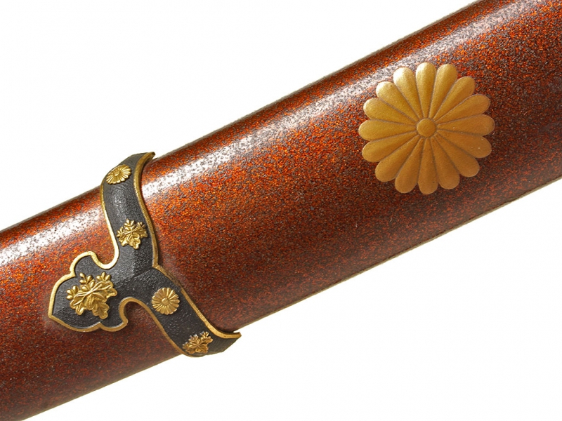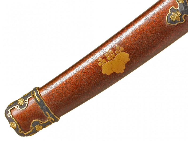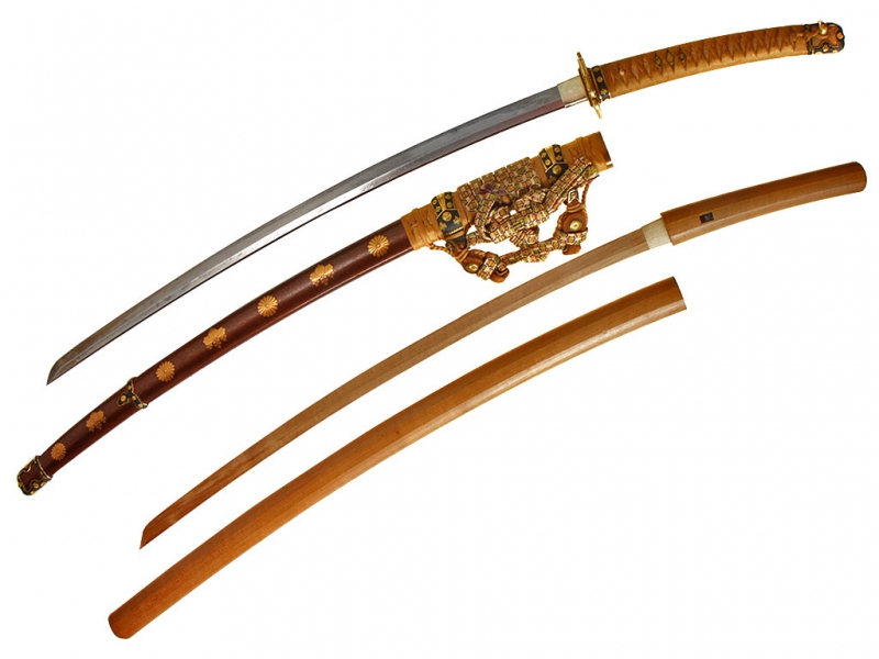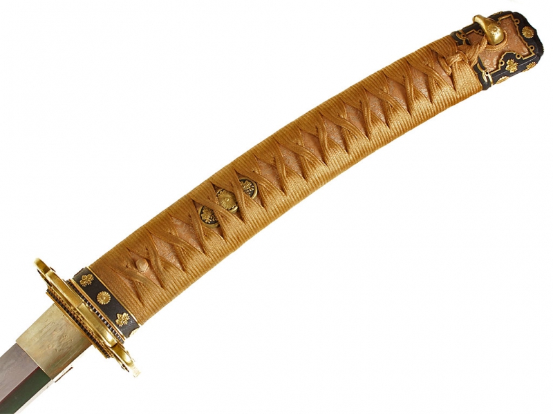 Большой самурайский меч тати работы мастера Уда. Датируется 1317 - 1319 годами. Клинок с красивой, слегка волнистой линией закалки, хвостовик не подписан мастером, имеет три крепежных отверстия. Муфта хабаки позолочена. Рукоять деревянная, обтянутая шелком, оплетена тесьмой горчичного цвета. Цуба стальная с золочеными элементами и ободком, украшена изображениями цветов. Мэнуки овальной формы украшены золочеными изображениями хризантем. В комплект входит сира-сайя для хранения клинка.