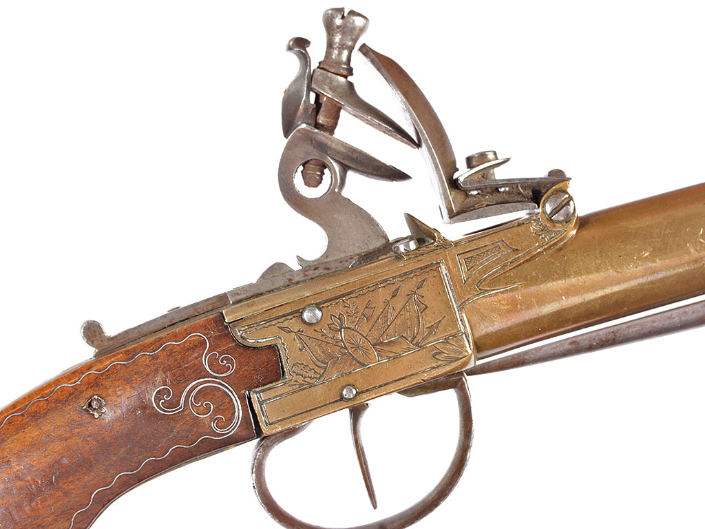 Пара флотских пистолетов произвольного типа с кремневыми замками, изготовленных в первой четверти XIX века. Стволы латунные, чуть расширяющиеся к дульному срезу: пистолеты заряжались картечью. С левой и правой сторон замка выгравированы изображения военной арматуры. Приемочные клейма в виде буквы "V" под короной - у основания ствола. Рукояти изготовлены из орехового дерева и инкрустированы тонкой серебряной проволокой. Скоба каждого пистолета представляет собой защелку, если отвести ее немного назад, раскладывается подпружиненный штык, расположенный под стволом, что превращает однозарядный пистолет в холодное оружие ближнего боя. Отличное состояние, замки исправны.
