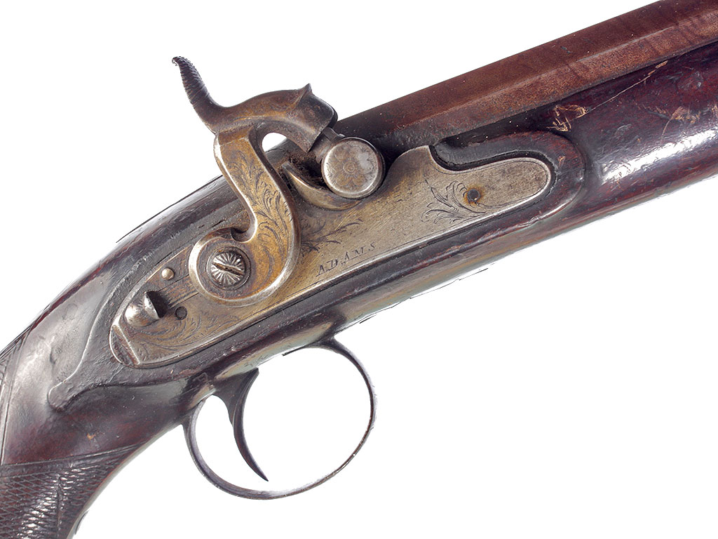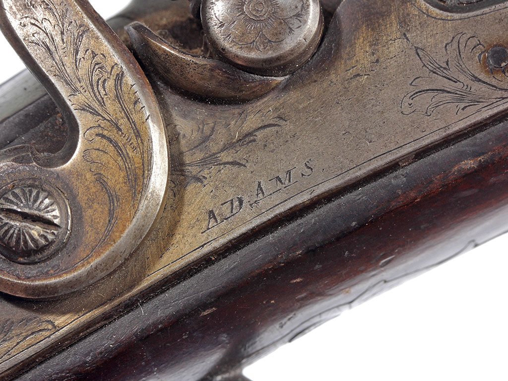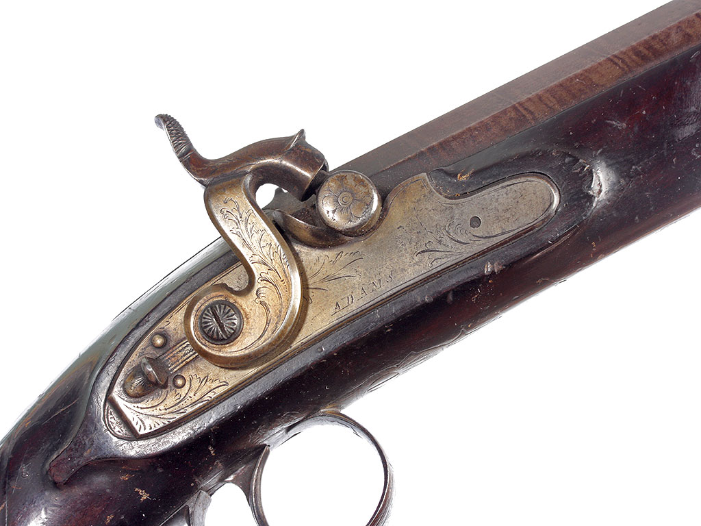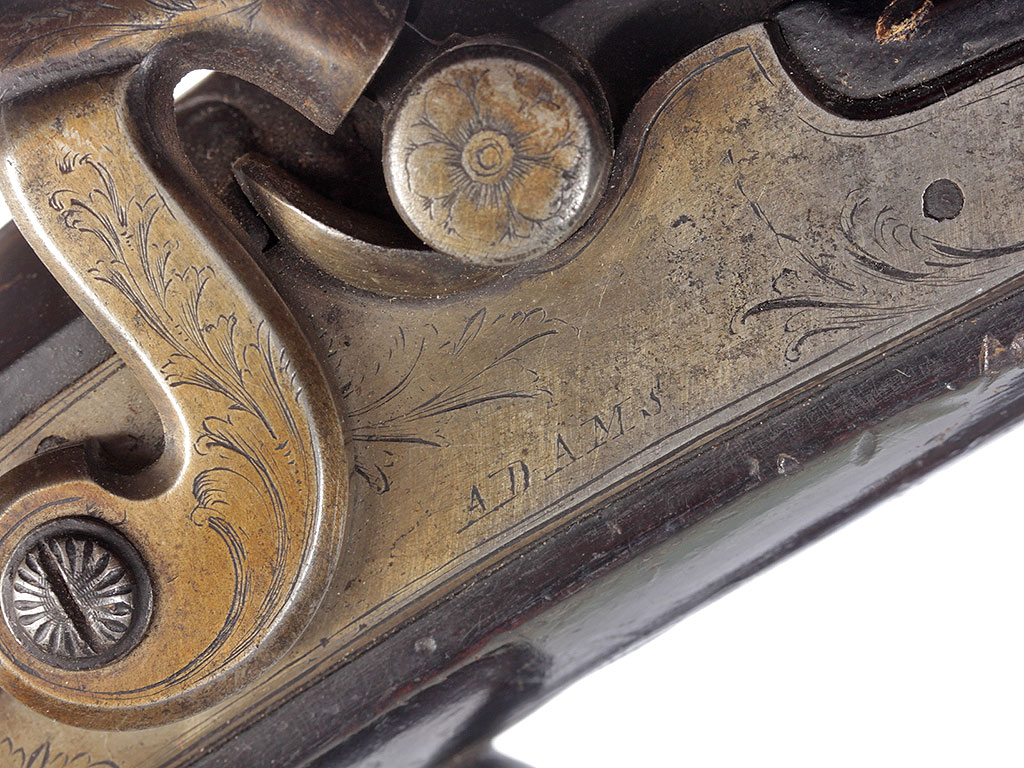 Пара дорожных пистолетов произвольного образца с капсюльными замками, изготовленных во второй трети XIX века. Гладкие восьмигранные стволы дамаскированы. На верхней грани имеется гравированная надпись "London". Замок каждого пистолета украшен гравированным орнаментом, на замочной доске имеется фамилия мастера "Adams". Скобы с курками также украшены художественной гравировкой. Деревянная рукоять каждого пистолета покрыта тонкой штриховой насечкой для удобства удержания оружия в руке. Замки полностью исправны.