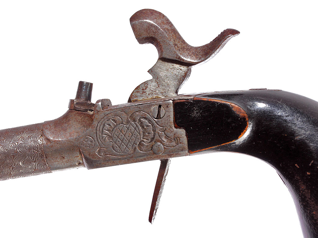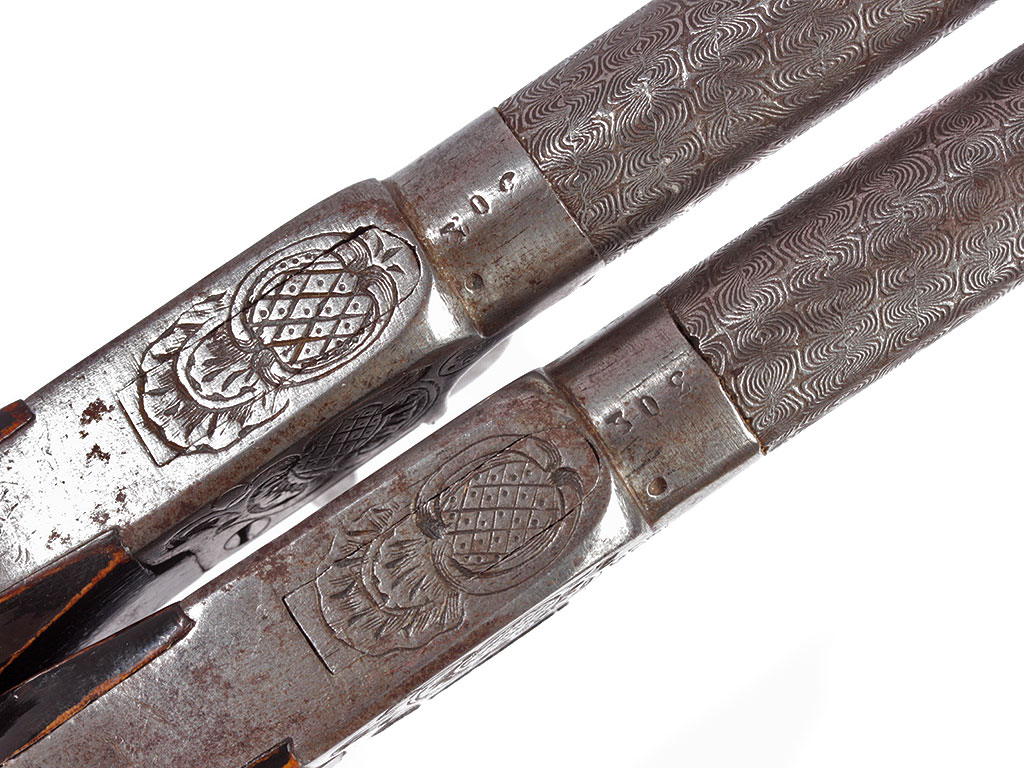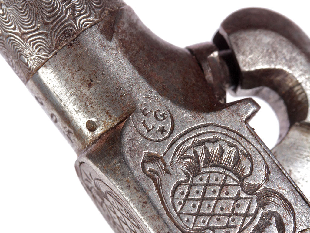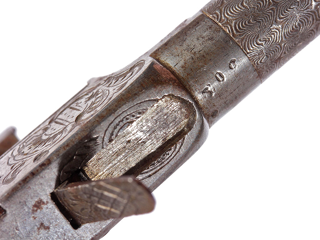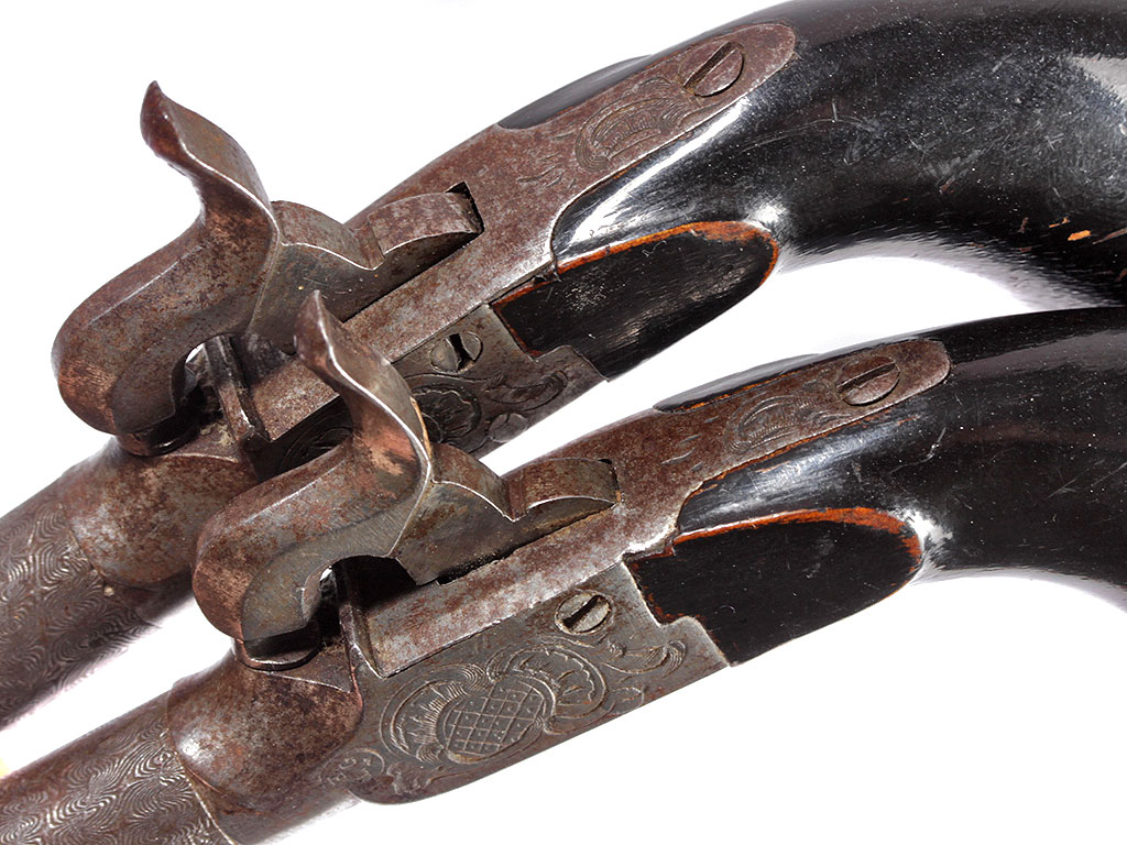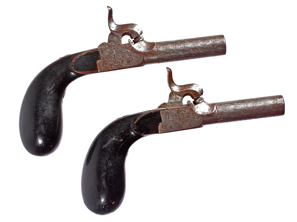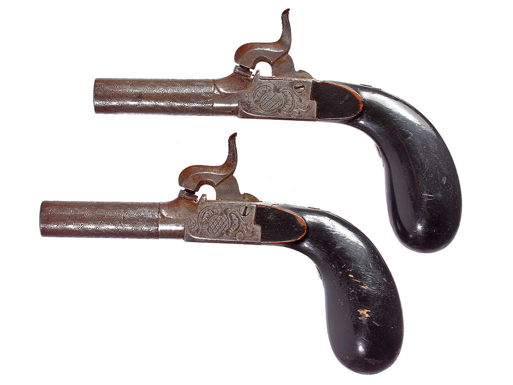 Пара классических жилетных пистолетов с капсюльными замками, изготовленных во второй четверти - середине XIX века. Стволы не имеют нарезов, отвинчиваются (для удобства чистки). Сбоку у основания стволов имеются Льежские приемочные клейма. Рама с обеих сторон украшена гравированными картушами с орнаментом. Спусковые крючки изготовлены складными для удобства ношения, они раскладываются при взводе курка. Деревянная рукоять каждого пистолета изготовлена из ореха. Очень хорошее состояние, замки исправны.