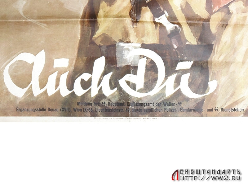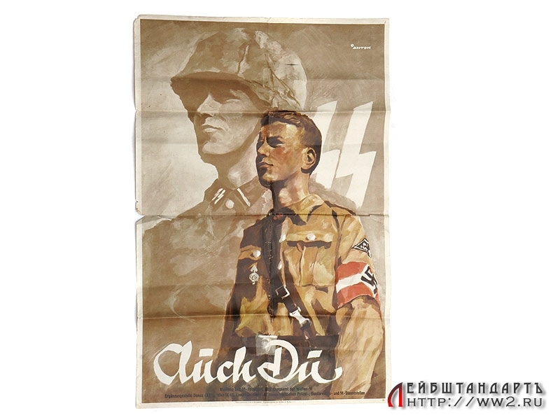 Оригинальный плакат СС с изображением подростка из "Гитлер Югенд" на фоне солдата СС в камуфлированной униформе с надписью "Auch Du!" - "Ты тоже!". Известный классический плакат, очень часто встречающийся в литературе и хронике. Под девизом помещен текст: "Meldung bei: SS-Hauptamt, Ergaenzungsamt der Waffen-SS. Ergaenzungstelle Donau (XVII), Wien IX/66, Liechtensteinstr. 49, sowie saemlichen Polizei-, Gendarmerie- und SS Dienstellen" - что переводится как "Запись в: Главном управлении СС, дополнительных отделениях Ваффен-СС, отделении Дунай (XVII), Вена IX/66, ул. Лихтенштайн 49. а также ближайших других отделениях Полиции, Жандармерии и СС".