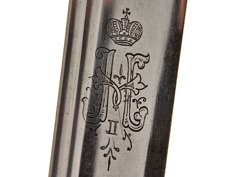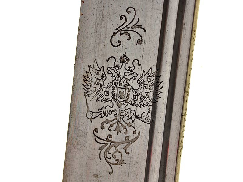Наградной образец офицерской шашки драгунского типа образца 1909 года - Анненское оружие "За храбрость". Клинок Златоустовской работы, с обеих сторон украшен изображениями двуглавого орла и вензеля Императора Николая II. На обухе имеется надпись "Злат.Ор.Фабр.", у основания клинка имеются приемочные клейма. Рукоять из тонированного в черный цвет дерева, прибор бронзовый, золочение сохранилось только в недоступных для чистки местах. На навершии рукояти - вензель Николая Второго, в правление которого владелец получил свой первый офицерский чин. На дужке с лицевой стороны - гравированная надпись "За храбрость". Верхняя втулка рукояти - с укрепленным на торце знаком ордена св.Анны IV степени. Эмаль на знаке не сохранилась, сам знак потерт от ношения.