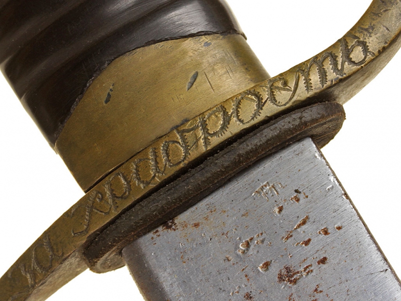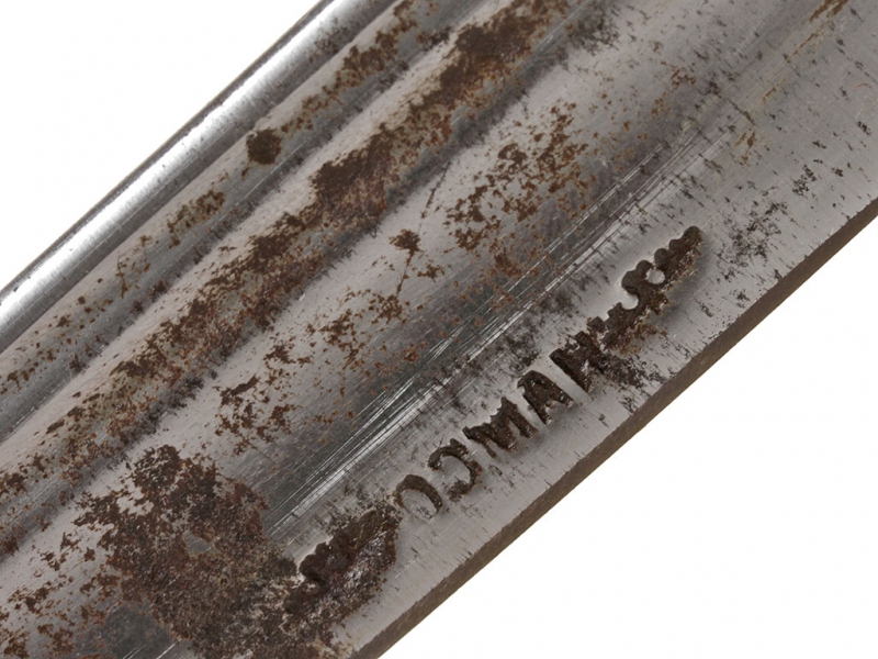 Наградной образец офицерской шашки драгунского типа образца 1909 года - Анненское оружие "За храбрость". Клинок заказной, с двумя узкими и одним широким долом, с лицевой стороны четко просматривается клеймо изготовителя клинка - "Османъ". Рукоять из черного бакелита, с укрепленным с лицевой стороны знаком ордена св.Анны IV степени. Прибор бронзовый, золочение почти не сохранилось. На верхней втулке рукояти - вензель Николая Второго, в правление которого владелец получил свой первый офицерский чин. На дужке с лицевой и оборотной стороны - гравированная надпись "За храбрость".