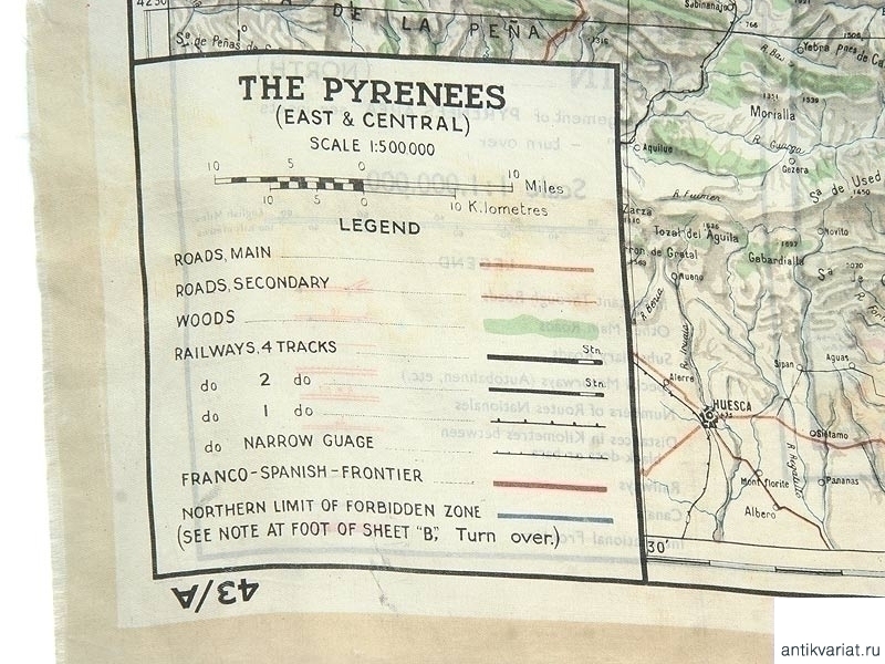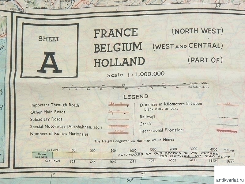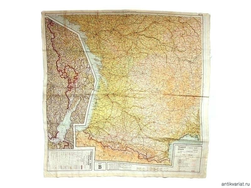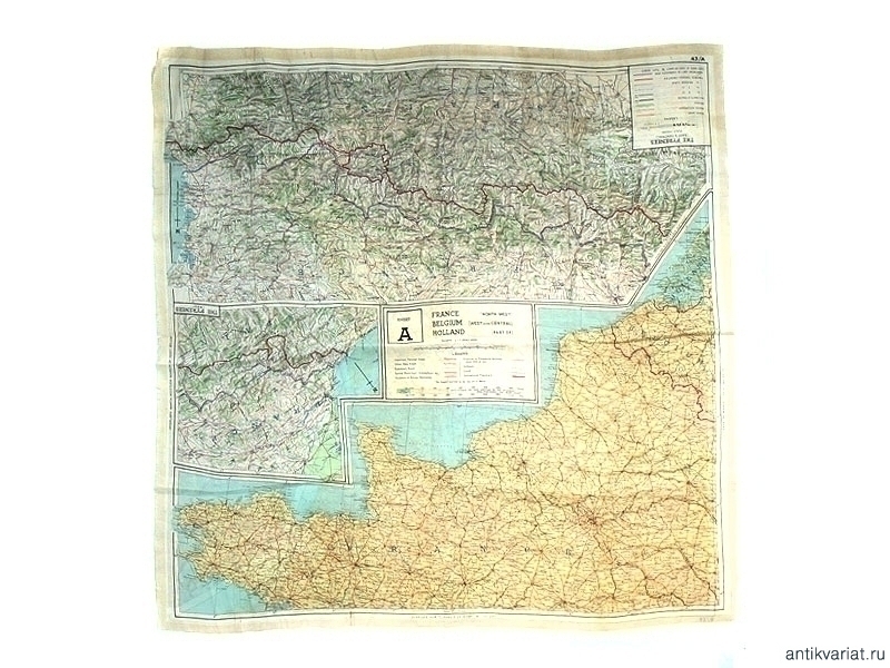 Армейская карта местности, включающая в себя часть Франции, Бельгии и Италии, выпущенная для военнослужащих английской армии к началу боевых действий в Европе при открытии Второго фронта. На тканевой основе, отличное состояние.