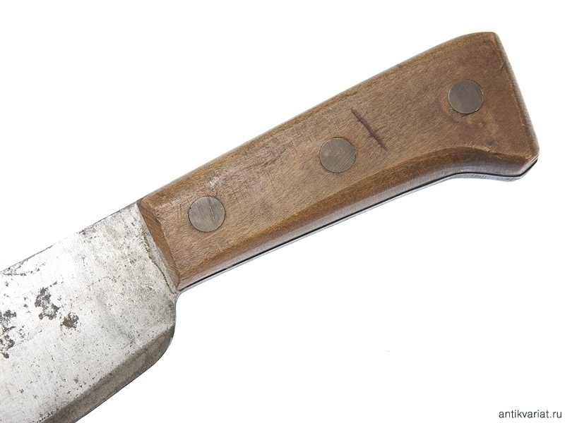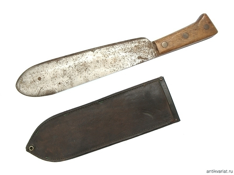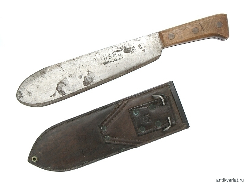 Армейский нож-мачете периода Второй мировой войны. Клеймо на клинке: "USMC Chatillon N.Y." Деревянные накладки рукояти, на кожаных ножнах - клеймо с годом изготовления: 1942. Хорошее состояние.