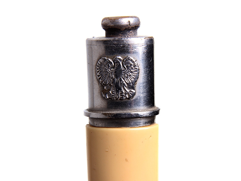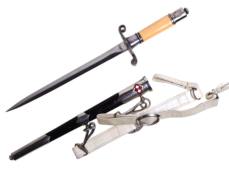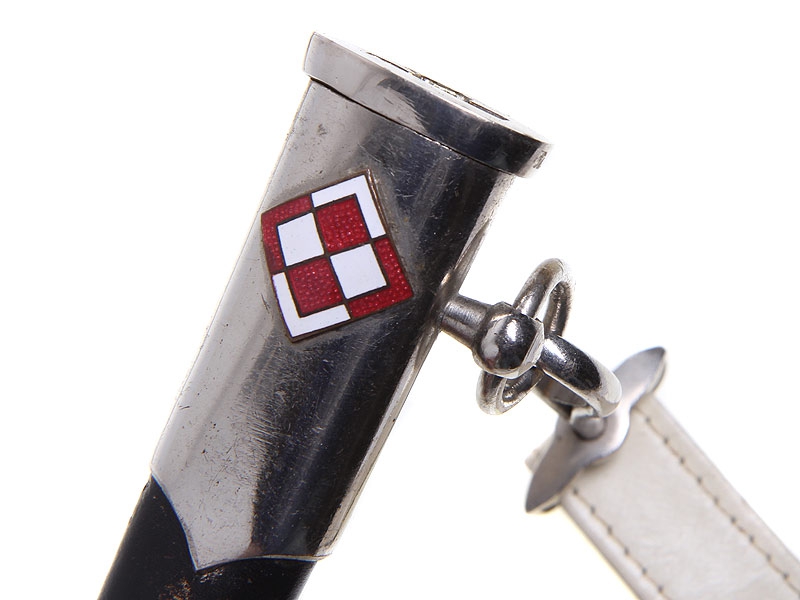 Армейский офицерский кортик образца 1954 года в отличном состоянии. Клинок никелированный, с порядковым номером у основания. Рукоять из пластмассы, навершие украшено изображением польского "легионерского" орла. Ножны обтянуты черной кожей, прибор посеребренный, покрытый легким налетом красивой патины, на устье ножен - накладка с символикой польской армии. Кортик в комплекте с подвесом.