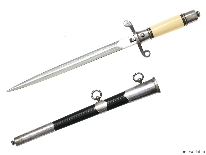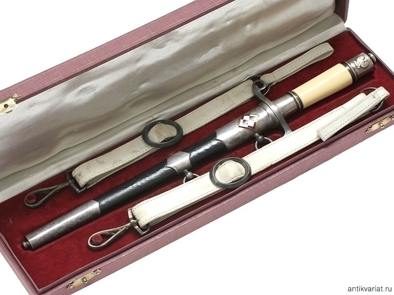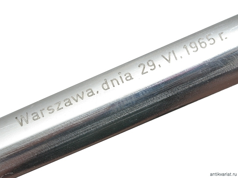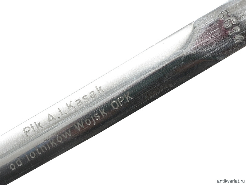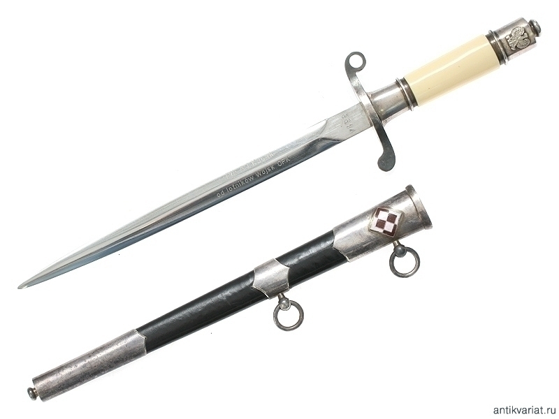 Армейский офицерский кортик образца 1954 года в отличном состоянии. Клинок никелированный, с порядковым номером у основания. По обеим сторонам клинка - травленая дарственная надпись советскому военнослужащему на польском языке: "Полковнику Казаку от летчиков Войска Польского, Варшава, 29 июня 1965 года". Рукоять из пластмассы, навершие украшено изображением польского "легионерского" орла. Ножны обтянуты черной кожей, прибор посеребренный, покрытый легким налетом красивой патины, на устье ножен - накладка с символикой польской армии. Кортик в оригинальном обтянутом дерматином футляре, с подвесом.
