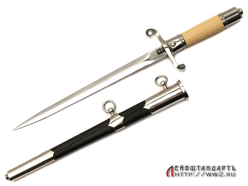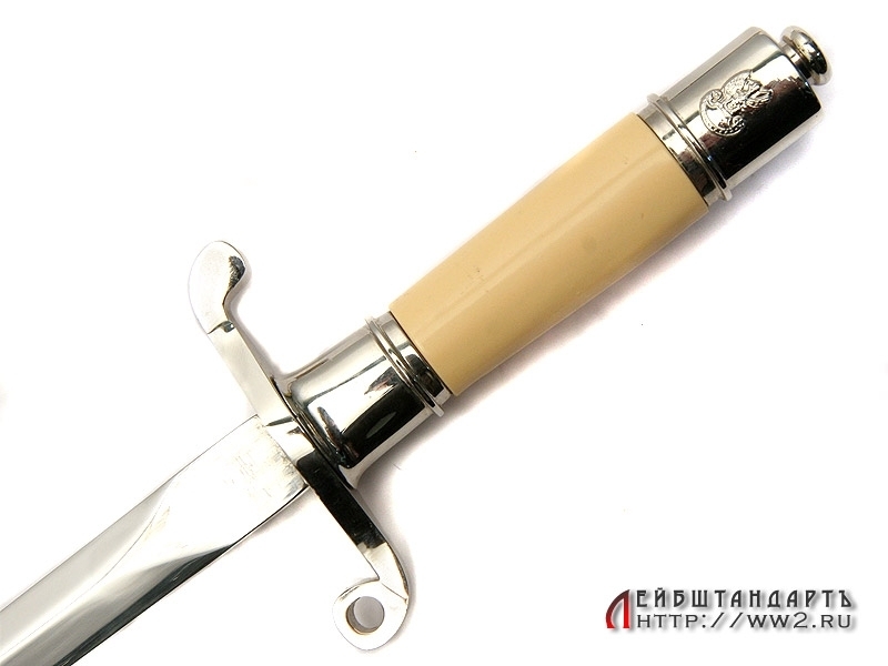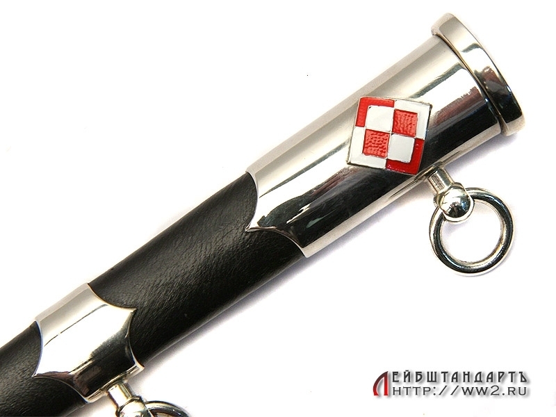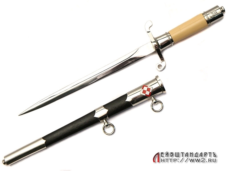 Армейский офицерский кортик образца 1954 года в отличном состоянии. Клинок никелированный, без клейм, рукоять из пластмассы, навершие украшено изображением польского "легионерского" орла. Ножны обтянуты черной кожей, прибор никелированный, на устье ножен имеется накладка с символикой польской армии.