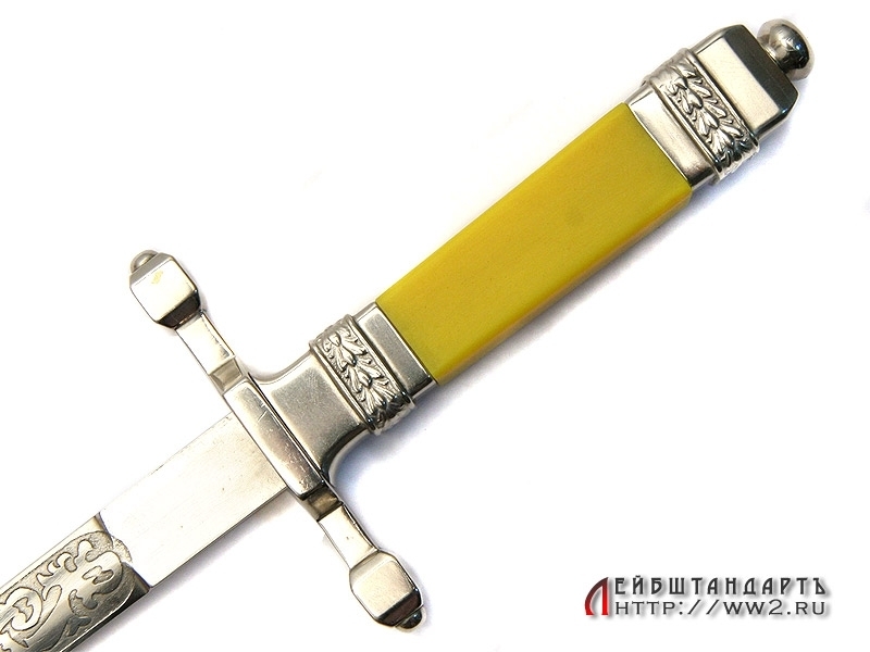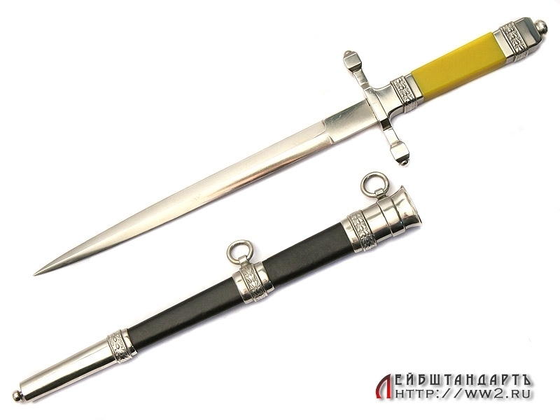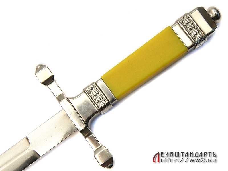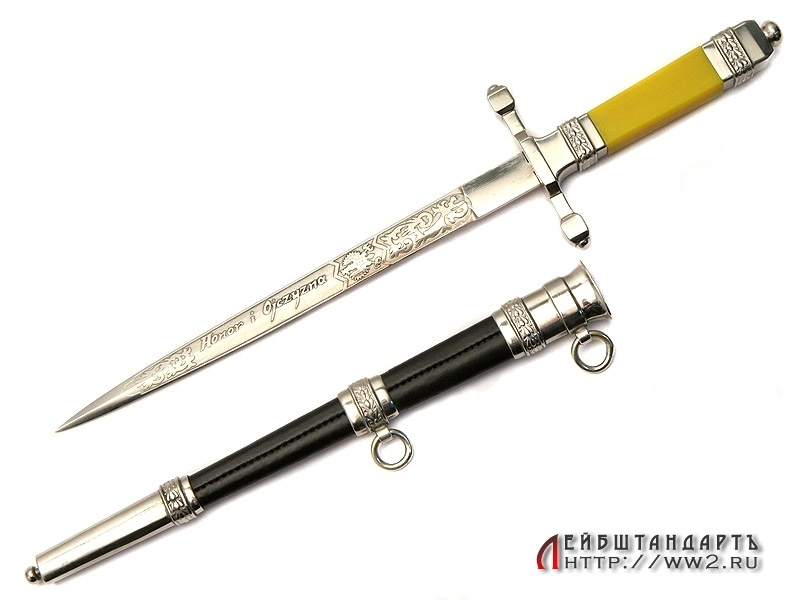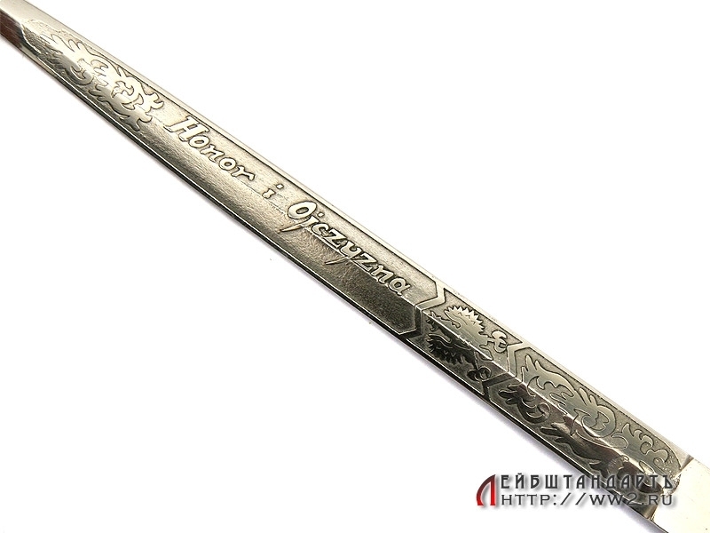 Армейский офицерский кортик образца 1937 года выпуска начала 1990-х годов в отличном состоянии. Клинок никелированный, украшенный травленой надписью "Честь и Отчизна", рукоять из пластмассы. Ножны обтянуты черной кожей.