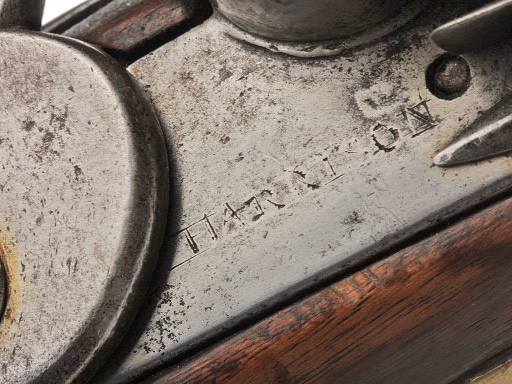Замок кремневый, подкладной, стальной, полированный. Курок плоский, с кольцом под нижней губкой. На замочной доске посередине выгравировано клеймо "HARRISON", а слева от курка выгравирована дата "1798" и схематичное изображение сердца под крестом с буквами "Е.Т.С.". Затравочная полка полукруглая снизу и соединена перемычкой с огнивом. Огниво выпуклое наружу, снизу с упором в пружину. Подогнивная пружина двуперая с фигурным хвостовиком. Замок крепится на два сквозных замочных винта.