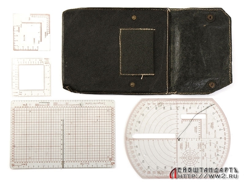 Идеальное состояние, полный комплект, K.W.27 - расшифровывается как - "Kartenwinkelmesser 27". Внутрия футляра находятся пластмассовые линейки для различных вычислений артиллерийской стрельбы. Достаточно редкий предмет из артиллерийского снаряжения. Можно вложить в планшет.