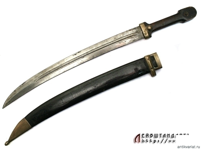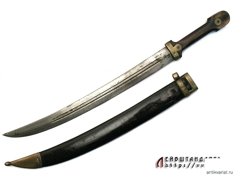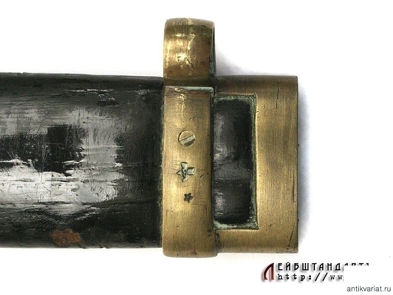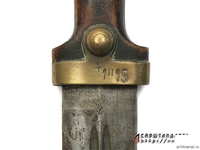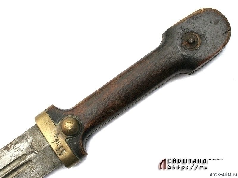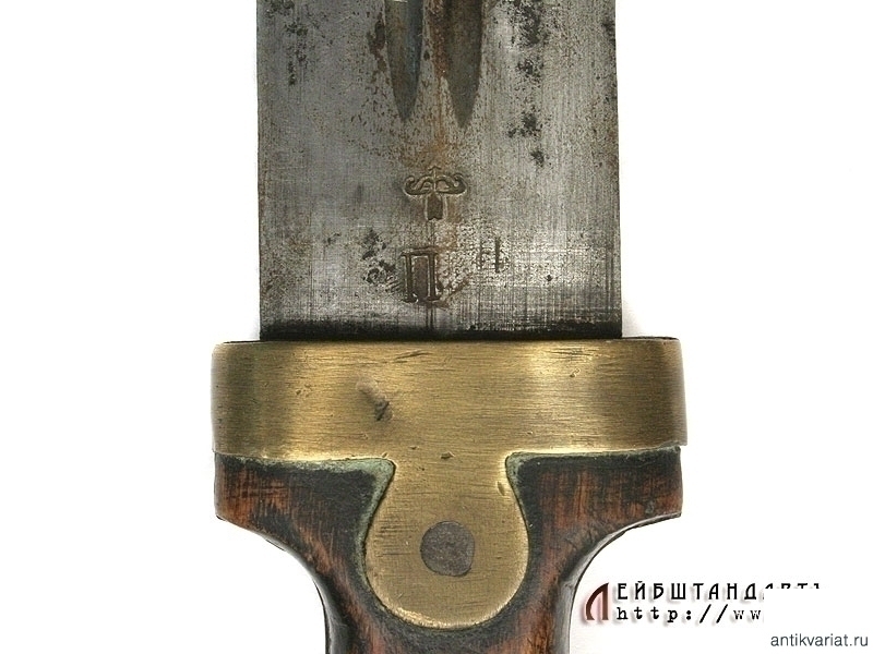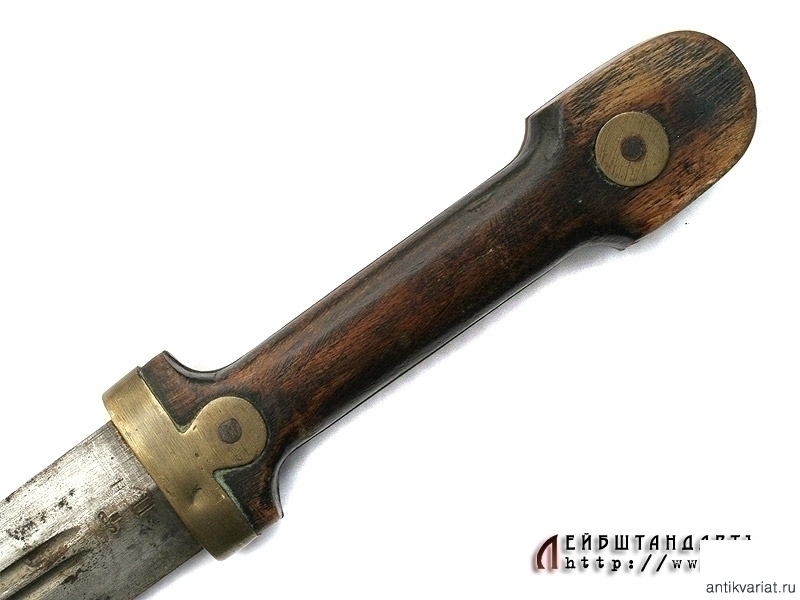 Русский артиллерийский бебут в очень хорошем состоянии. У основания клинка размещены клейма военной приемки. Накладки на рукояти деревянные, с двумя латунными заклепками (верхняя отсутствует) и устьем, на котором стоит клеймо подразделения, в котором служил владелец данного предмета.