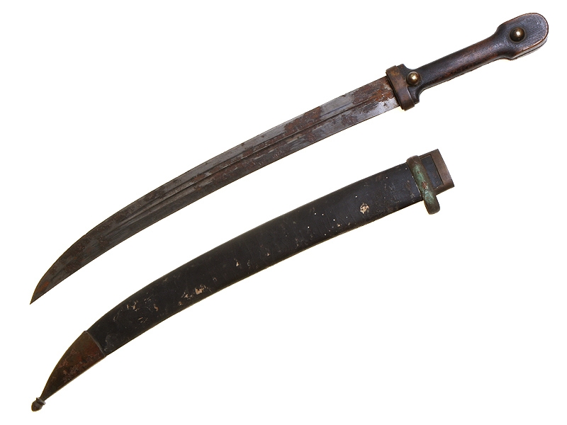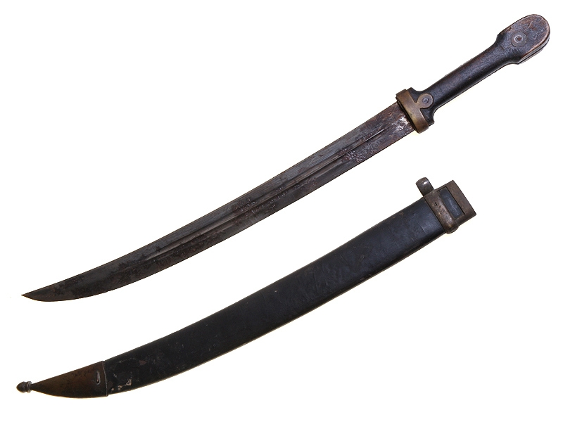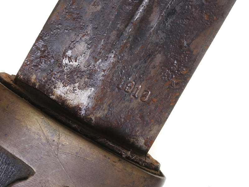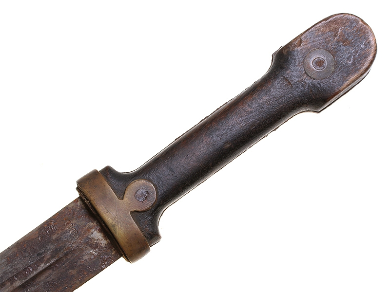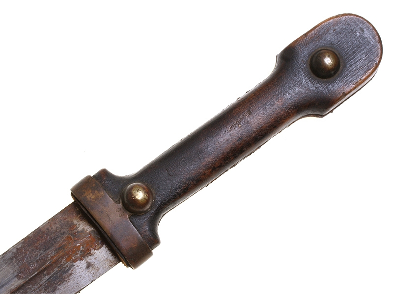 Артиллерийский бебут выпуска 1910 года, с клеймами Златоустовской оружейной фабрики и военной приемки у основания клинка. Накладки на рукояти деревянные, с двумя латунными заклепками и устьем. Ножны деревянные с латунным прибором.