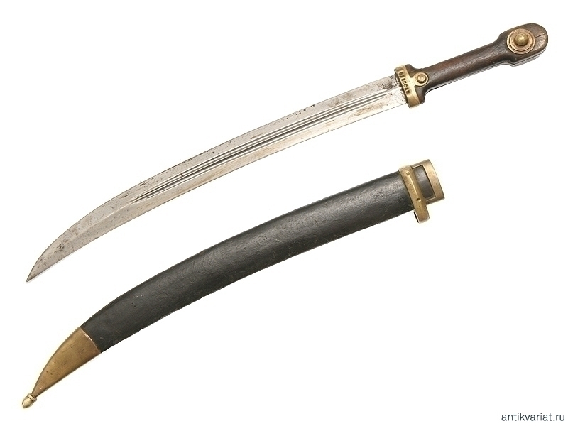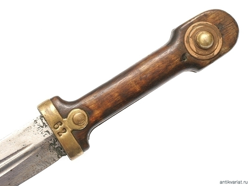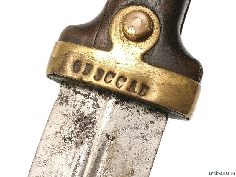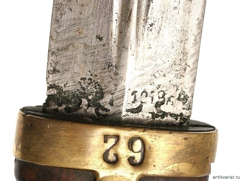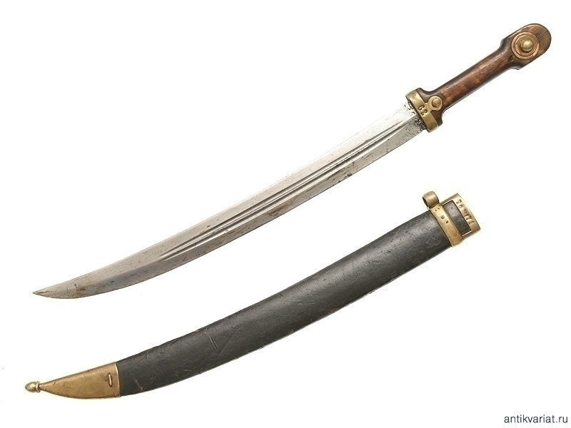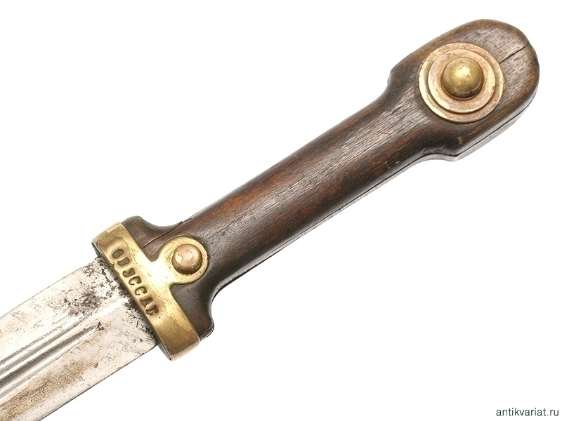 Артиллерийский бебут 1913 года выпуска, с клеймами военной приемки и Златоустовского оружейного завода. Накладки на рукояти деревянные, с двумя латунными заклепками и устьем. Заклепки ремонтные. Ножны деревянные с латунным прибором.