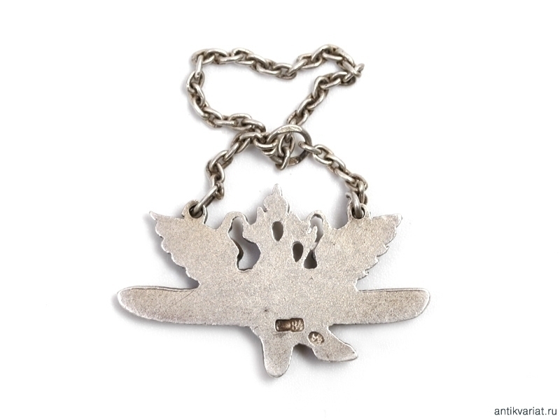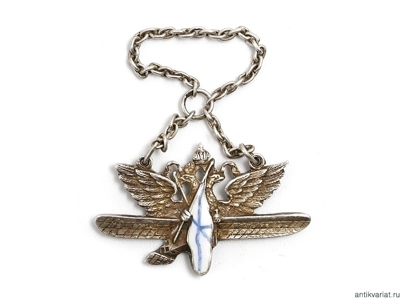 Авиационный жетон с эмалевым изображением Андреевского флага и самолета. Серебро 84 пробы, золочение. 1910-е годы. Отличное состояние.
