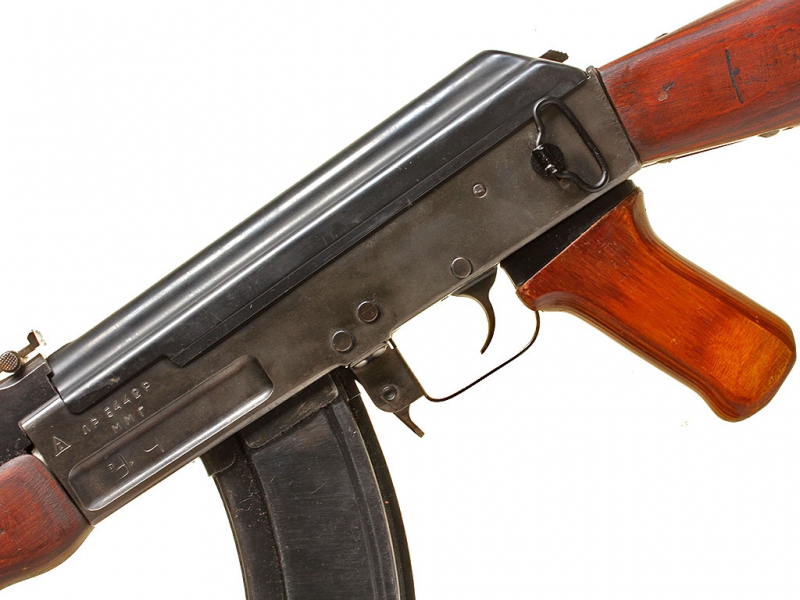 АКМ - модернизированный в 1959 году АК-47. Отличается уменьшенным на 700 грамм весом за счет изготовленных из пластмассы приклада, пистолетной рукоятки и цевья. Появился универсальный штык-нож и поперечные ребра жесткости на крышке ствольной коробки. Для повышения кучности стрельбы был установлен замедлитель огня и дульный компенсатор. Полностью он не вытеснил автоматы с деревянными деталями, параллельно производился и вариант с ребрами жесткости на ствольной коробке, компенсатором и деревянными деталями.
