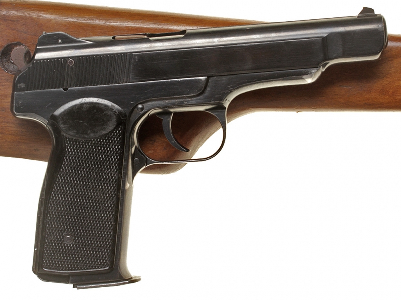 Автоматический пистолет системы Стечкина выпуска 1954 года. Очень хорошее состояние, оригинальное воронение. В деревянной кобуре.