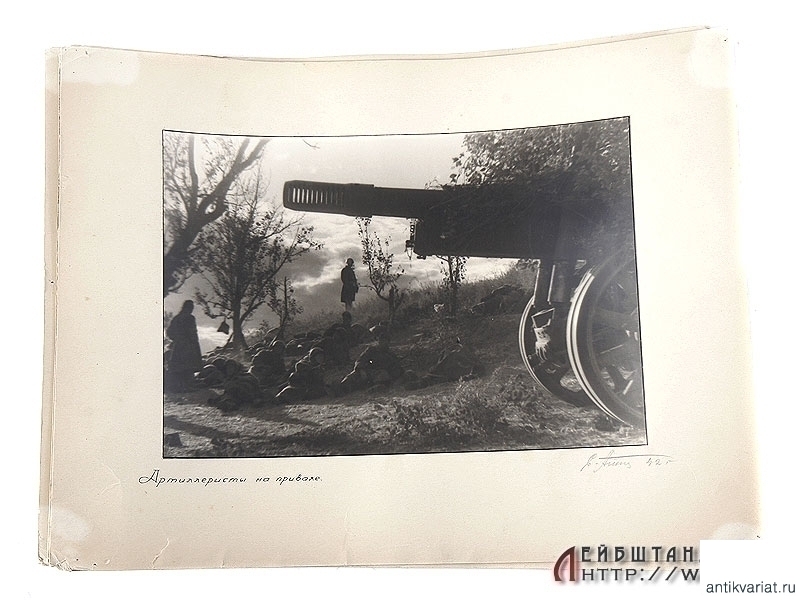 Большое авторское фото "Артиллеристы на привале", наклеенное на картонное паспорту. Имеется автограф автора и дата - 1942 год. Размер 42 х 32 см. Отличное состояние.