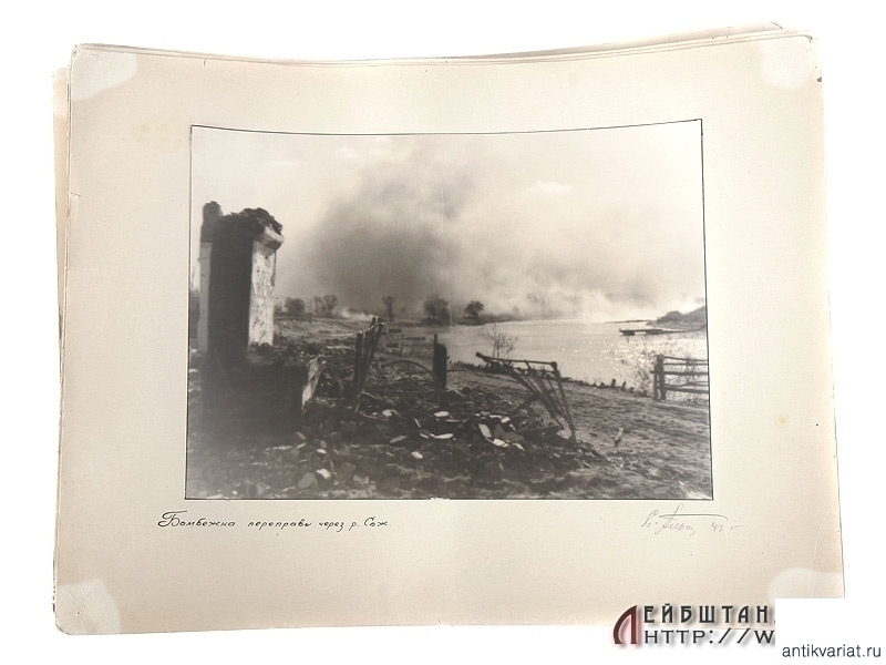 Большое авторское фото "Бомбежка переправы через реку Сож", наклеенное на картонное паспорту. Имеется автограф автора и дата - 1943 год. Размер 42 х 32 см. Отличное состояние.