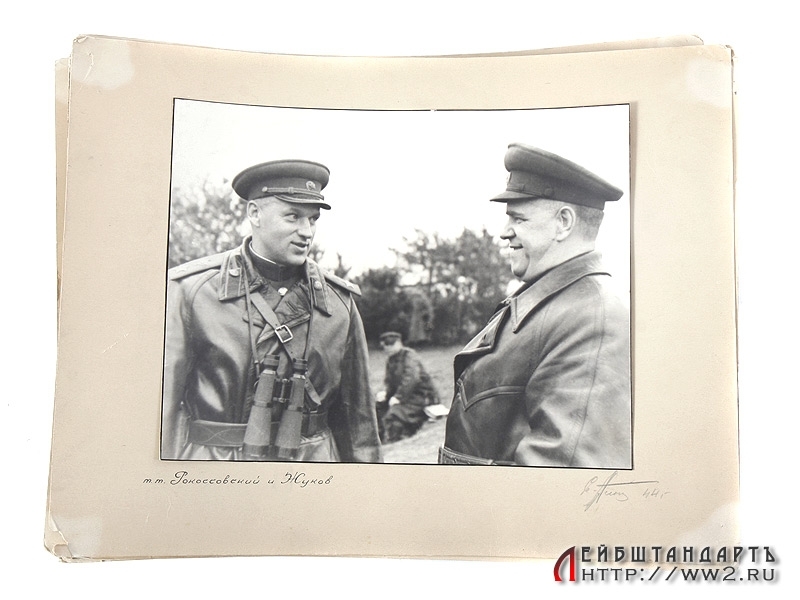 Большое авторское фото "Тов. Рокоссовский и Жуков", наклеенное на картонное паспорту. Имеется автограф автора и дата - 1944 год. Размер 42 х 32 см. Отличное состояние.