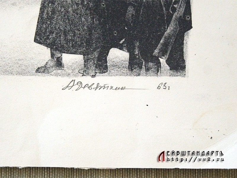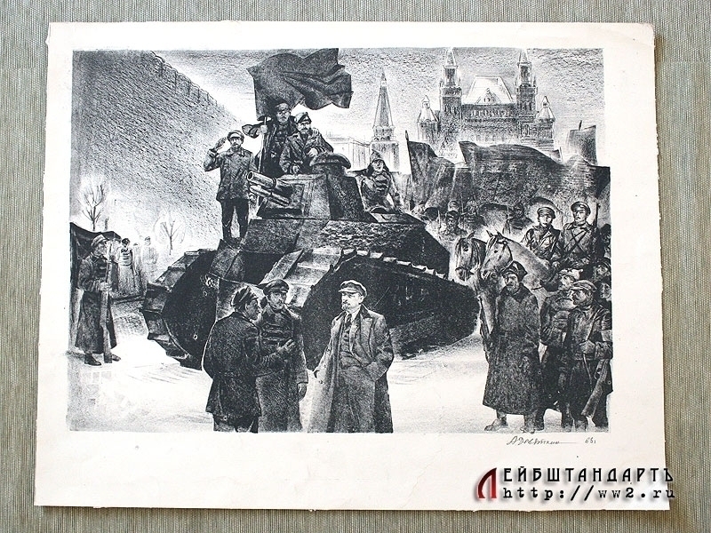 Авторская литография "Парад на Красной площади в 1918 году", размером 65,5 X 51,5 см. Работа члена Союза художников Александра Девяткина (1934 - 2001 г.г.), известного советского живописца и графика, созданная в 1969 году. Прекрасно построена композиция, проработаны детали, работа являет собой классический пример социалистического реализма.
