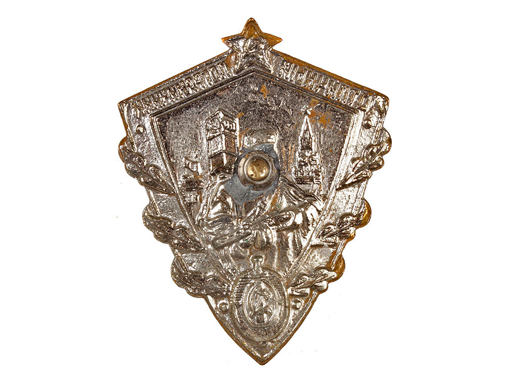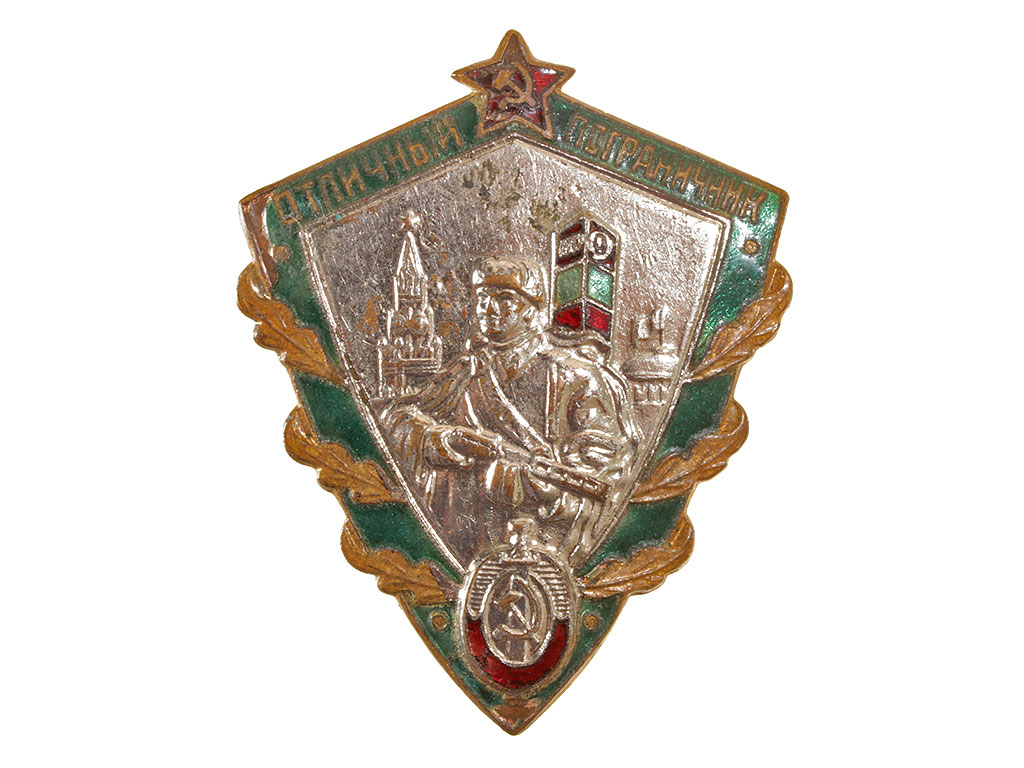 Знак "Отличный пограничник" (переходной тип, без надписи на ленте). Томпак, серебрение, эмаль. Хорошее состояние, имеется незначительные сколы эмали. Закрутка отсутствует.