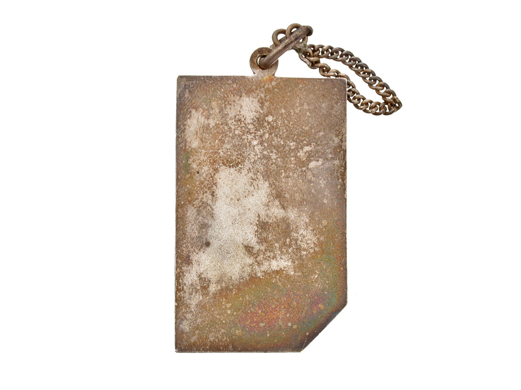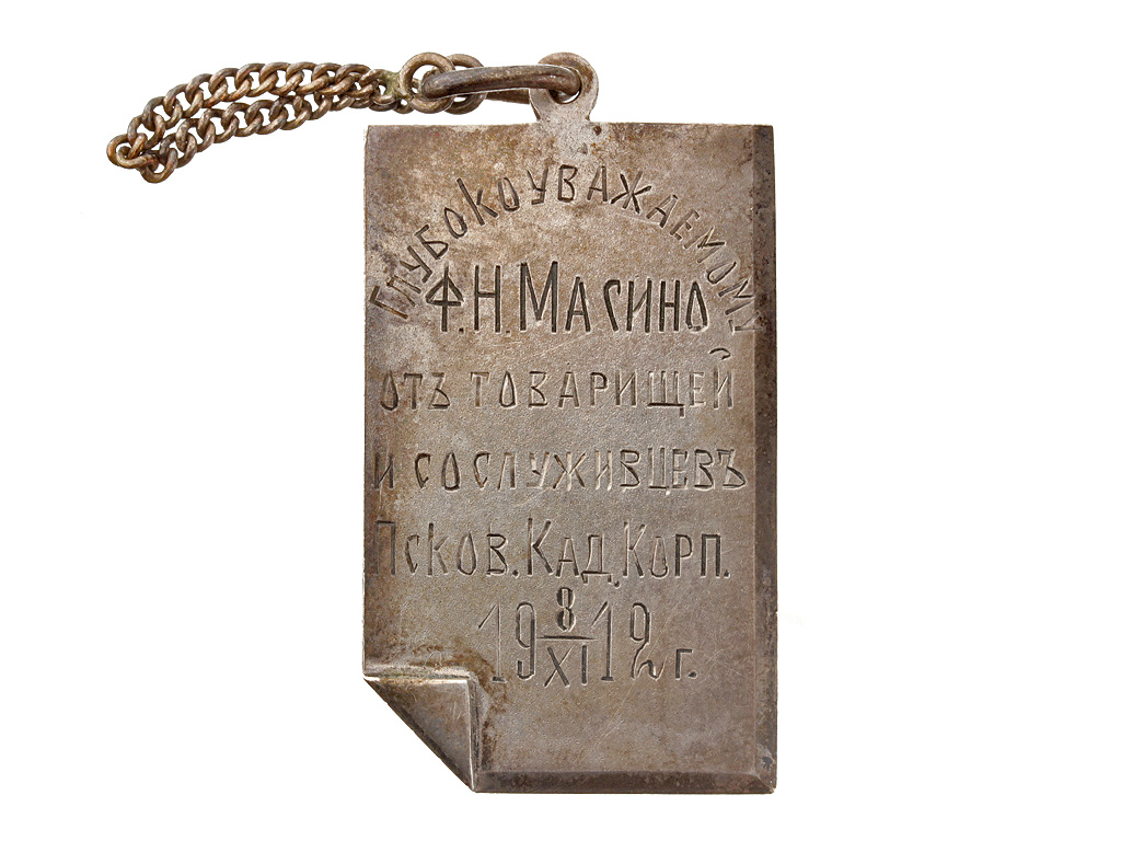 Прямоугольной формы жетон Псковского кадетского корпуса, 1912 год. Выдан на имя Ф.Н. Масино. Неизвестная мастерская. На жетоне надпись: "Глубокоуважаемому Ф.Н. Масино отъ товарищей и сослуживцевъ Псков.Кад.Корп. 19 8/XI 12 г.". Серебро.