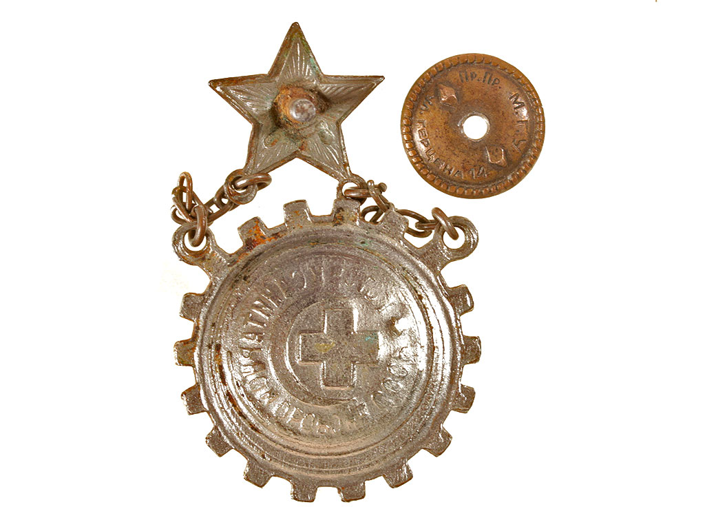 Знак "Готов к санитарной обороне СССР". Магнитный металл, никелировка, эмаль.