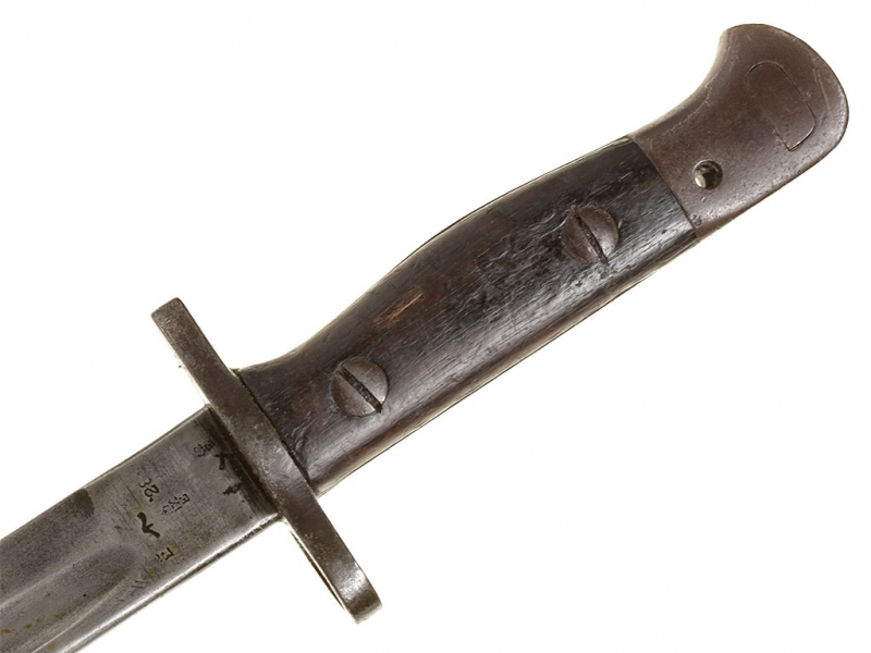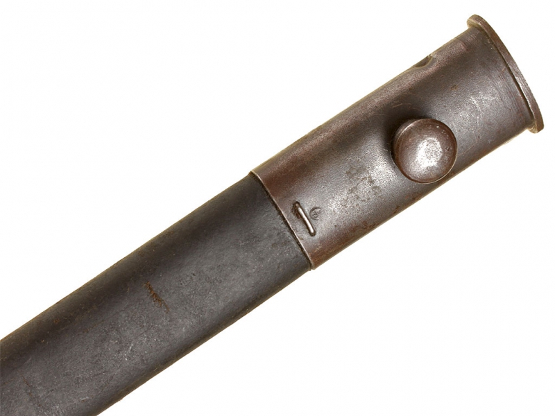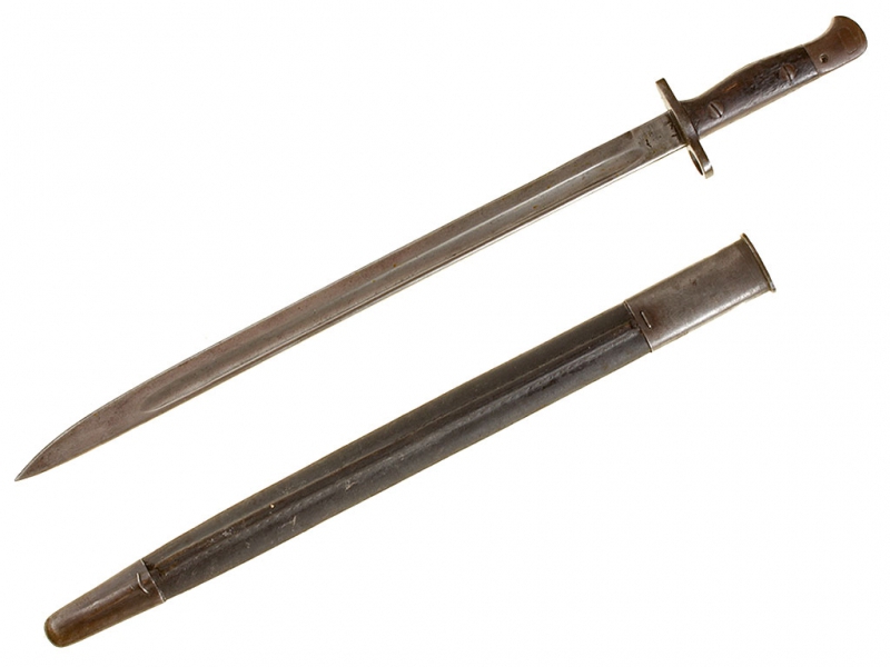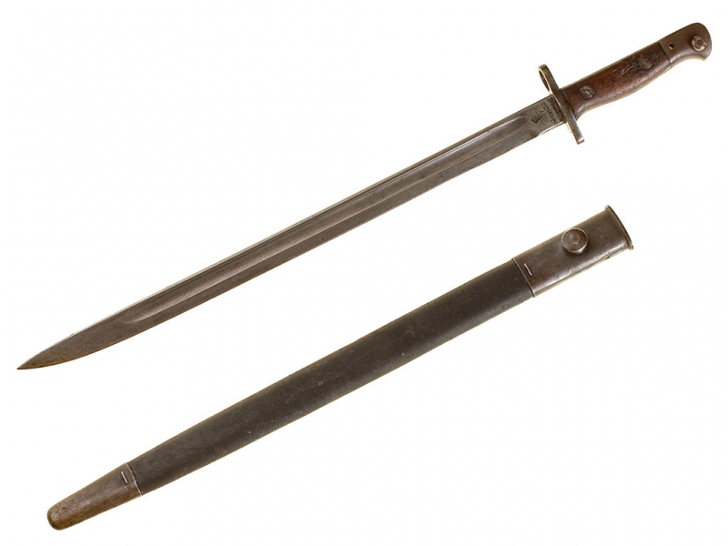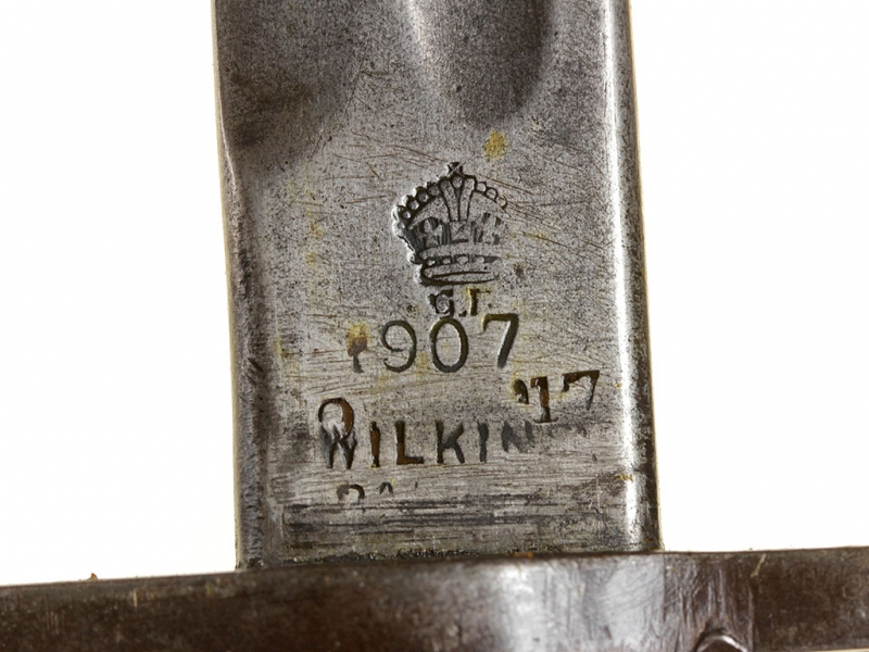 Штык английский образца 1907 года в очень хорошей сохранности. Клинок с одним долом, оригинальное воронение не сохранилось. У основания клинка находятся клейма фирмы-изготовителя "Wilkinson", клейма военной приемки и год выпуска (1907). Эфес стальной, вороненый, с деревянными щечками и кнопкой-фиксатором. Ножны кожаные, с железными устьем и наконечником.