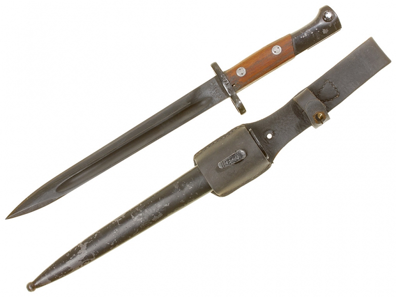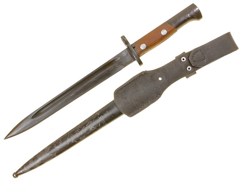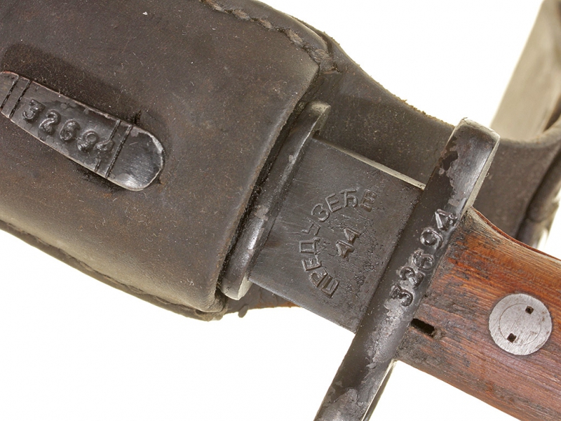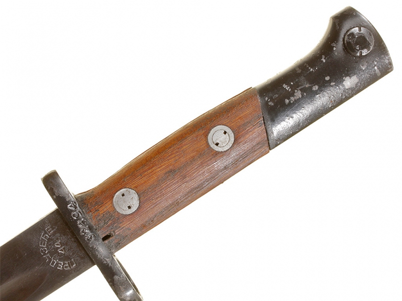 Штык югославского производства к винтовке системы Маузера образца 1924 года. Клинок в оригинальном воронении. У основания клинка находится клеймо "ПРЕДУЗЕТЕ 44". Рукоять стальная с двумя деревянными накладками, на гарде имеются номера и клейма военной приемки. Ножны стальные. Оригинальный кожаный подвес.