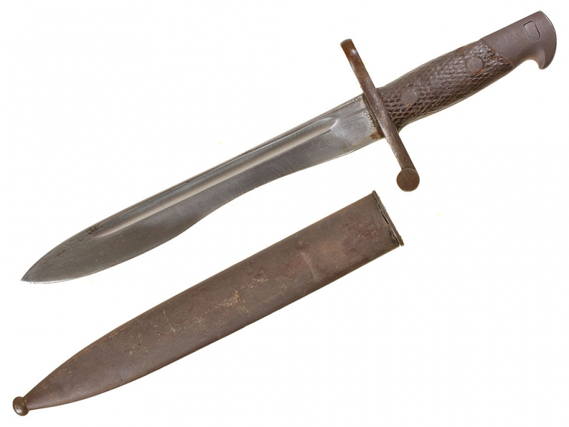 Рукоять образована двумя деревянными рифлеными щечками, скрепленными с хвостовиком клинка двумя винтами. Спинка рукояти слегка выгнута. В стальной головке - Т-образный паз и пружинная защелка с внутренним расположением спиральной пружины. Крестовина прямая с кольцом для ствола со стороны обуха клинка.