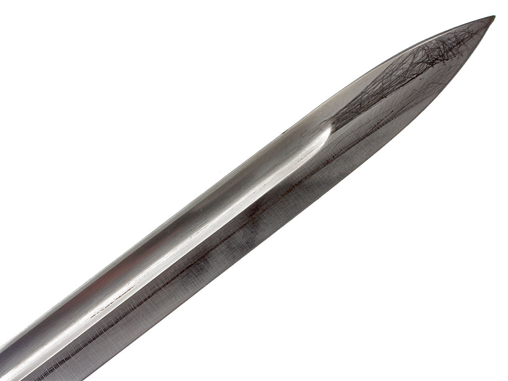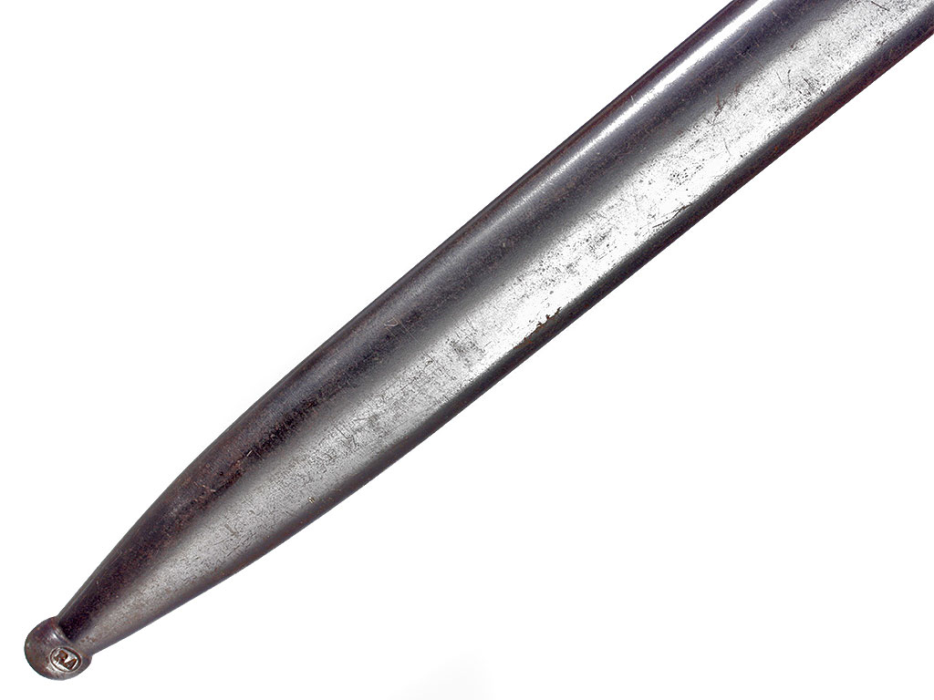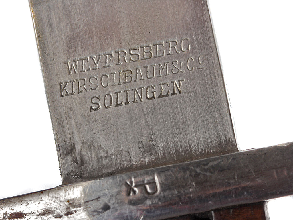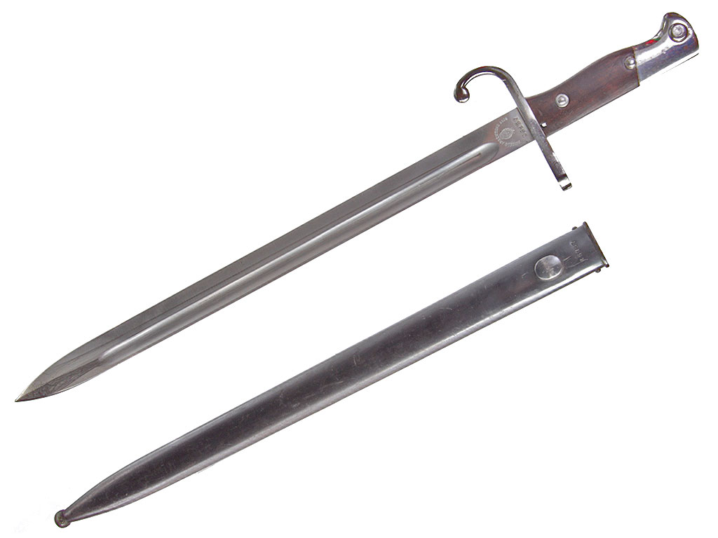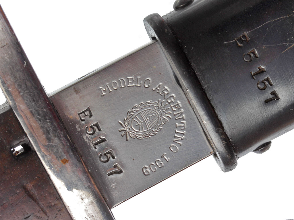 Штык образца 1909 года к винтовке системы Маузер образца 1909 года. Клинок прямой, однолезвийный, с долом на каждой стороне, у основания с левой стороны имеется клеймо изготовителя "Weyersberg / Kirschbaum & Co. / Solingen" (штык производился в Германии по аргентинскому военному заказу), а с правой - клеймо "Modelo Argentino 1909" с гербом Аргентины и номером оружия (Е 5157). Рукоять образована двумя деревянными щечками, скрепленными с хвостовиком клинка двумя заклепками. В головке рукояти Т - образный паз и пружинная защелка с внутренним расположением спиральной пружины. Крестовина с загнутым вниз концом, оканчивающимся шариком, и кольцом для ствола со стороны обуха клинка. Ножны стальные, вороненые, с овальным шпеньком для крепления подвеса и шариком на конце.