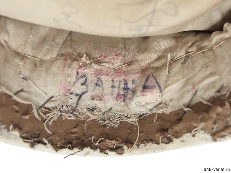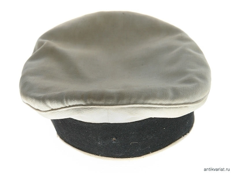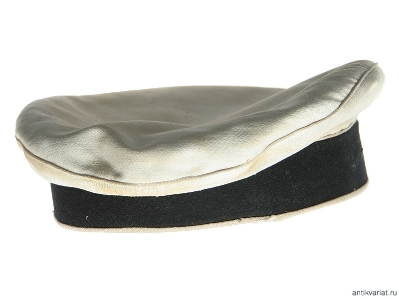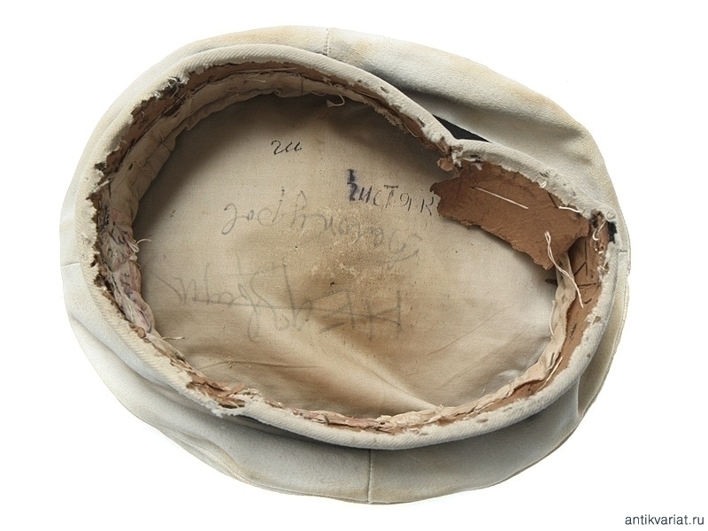 Матросская бескозырка 1910-х годов в хорошей сохранности. Белый верх без повреждений, черный околыш с отверстием от кокарды. Изнутри обшива околыша не сохранилась, картонная основа. Подкладка из белого шелка с подписями владельцев.