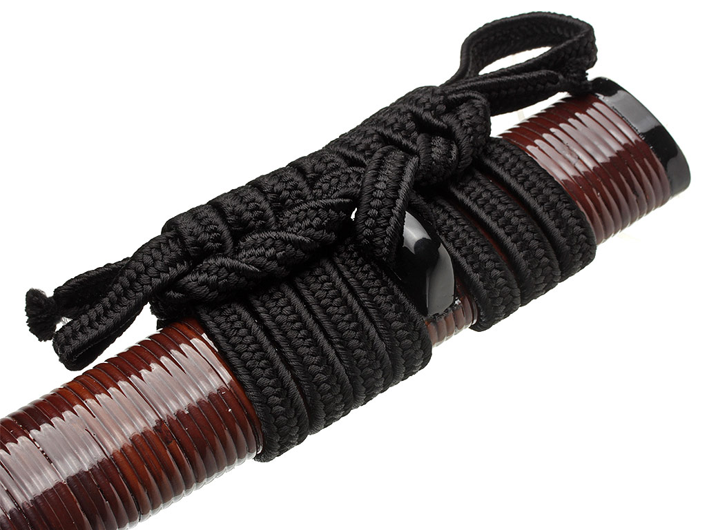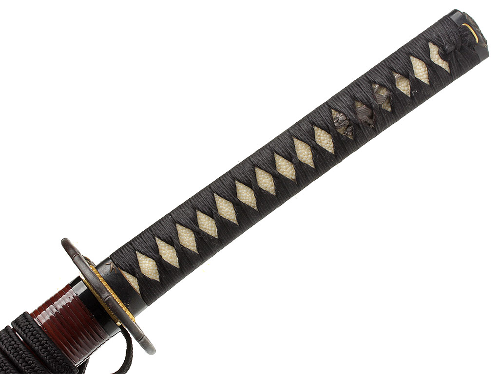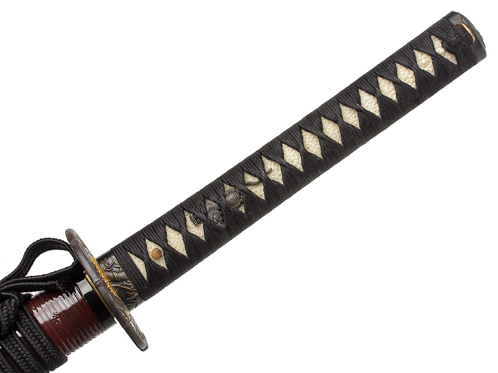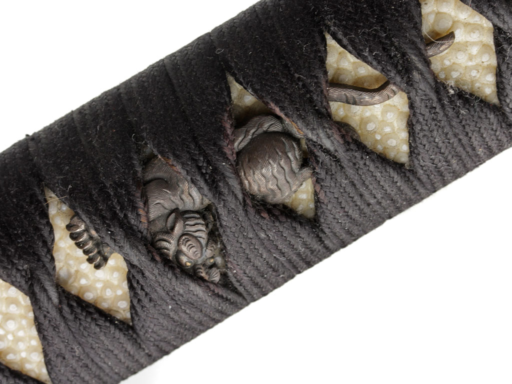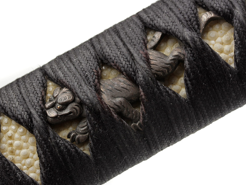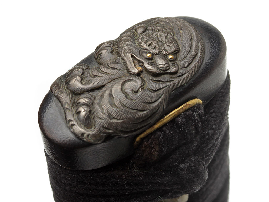 Рукоять (цука) образована двумя склеенными между собой деревянными частями с одним сквозным отверстием для колышка мэкуги. Покрыта шкурой ската (самэ). Поверх самэ в традиционном стиле наложена обмотка шелковым шнуром цука-ито черного цвета. Под оплеткой рукояти с обеих сторон помещены изготовленные из патинированного цветного металла рельефные художественные накладки мэнуки. Обе накладки выполнены в виде фигурок бегущего тигра. Рукоять увенчана чашеобразным навершием касира, а в ее основании находится муфта фути. Фути и касира изготовлены из сплава сякудо, представляют собой пару и украшены - фути изображениями стеблей бамбука, а касира - охотящегося тигра. На фути имеется иероглифическая подпись "Умерший в возрасте 72 лет старец Нан Дзан", нанесенная после смерти мастера кем-то из его учеников.