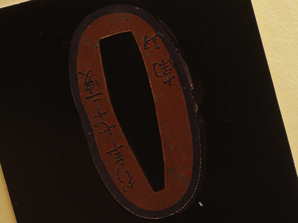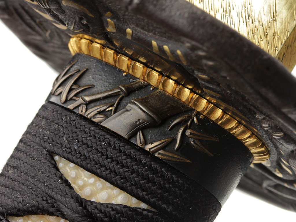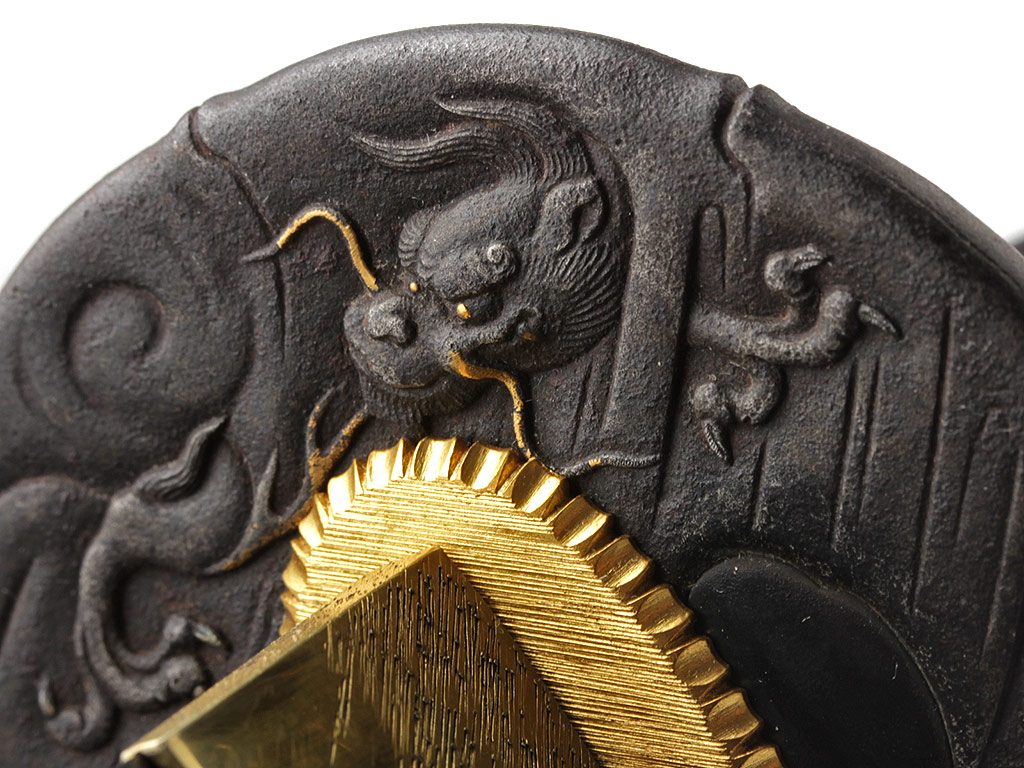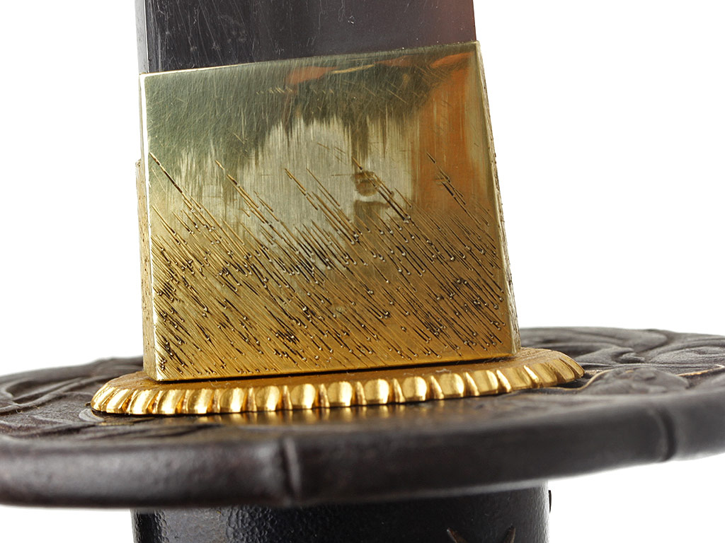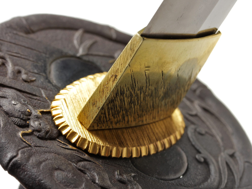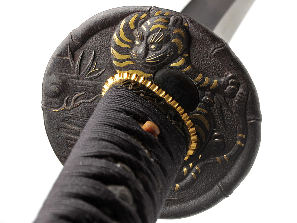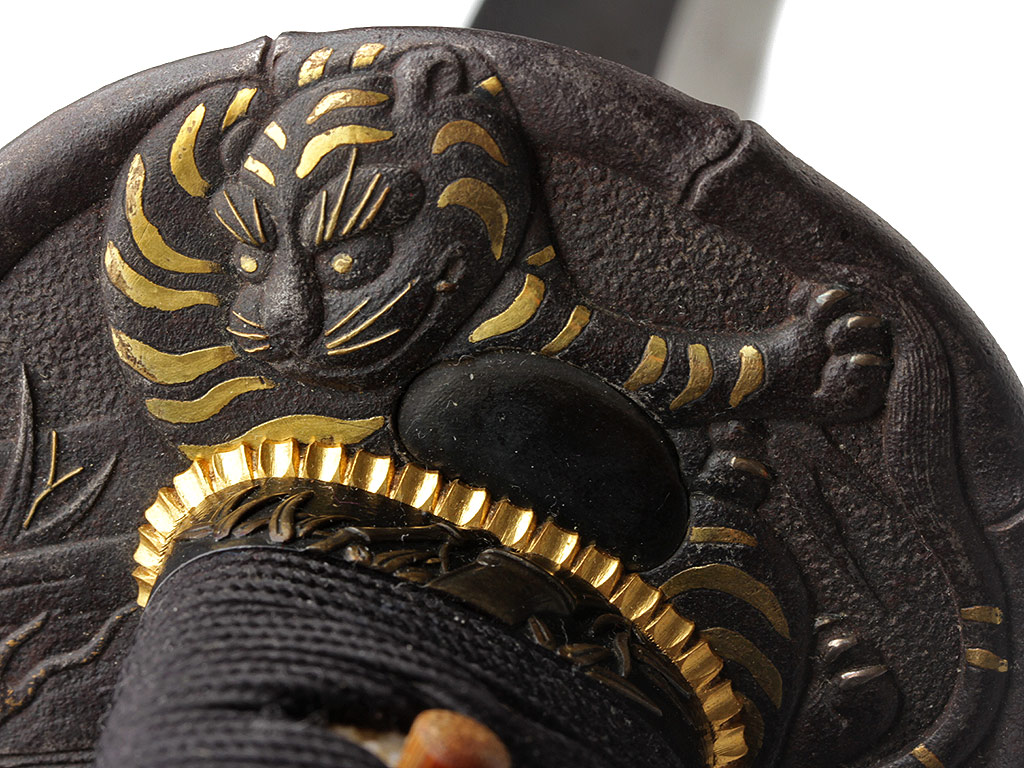 Гарда (цуба) круглой формы (мару-гата), выполнена из патинированного железа с элементами золочения и имеет два запломбированных пластинками из сплава сякудо отверстия для вспомогательных предметов, предусмотренных конструкцией ножен. Поверхность цубы с одной стороны украшена рельефным изображением затаившегося в бамбуковых зарослях тигра, а с другой - дракона. Край цубы оформлен в виде стебля бамбука. Подобные изображения периодически встречаются в элементах оправы японского меча; у японцев тигр всегда противопоставлялся дракону. Светлый дракон и темный тигр олицетворяли двойственность всего сущего. Это силы, которые могут как находиться в покое, так и противостоять друг другу с разрушительной силой. Кроме того, тигр часто изображается в одной композиции с бамбуком: сильный и грозный зверь нуждается в помощи слабого растения (бамбука) в борьбе против стихий. Поддержка, оказываемая бамбуком тигру символизирует почтение, которое слабейший выражает сильнейшему. Также пробирающийся через дикие заросли тигр символизирует силу добра, побеждающую силу зла.