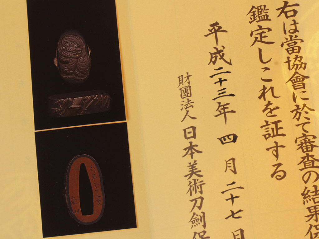 Клинок с экспертным заключением NBTHK и имеет статус "Оберегаемый меч". Тосоги также с экспертным заключением NBTHK и имеет статус "Оберегаемый". В комплект входит сира-сая для хранения клинка, а также чехол для хранения меча и оправы.