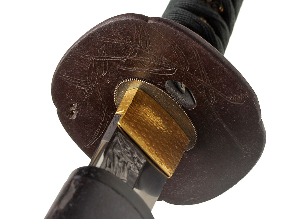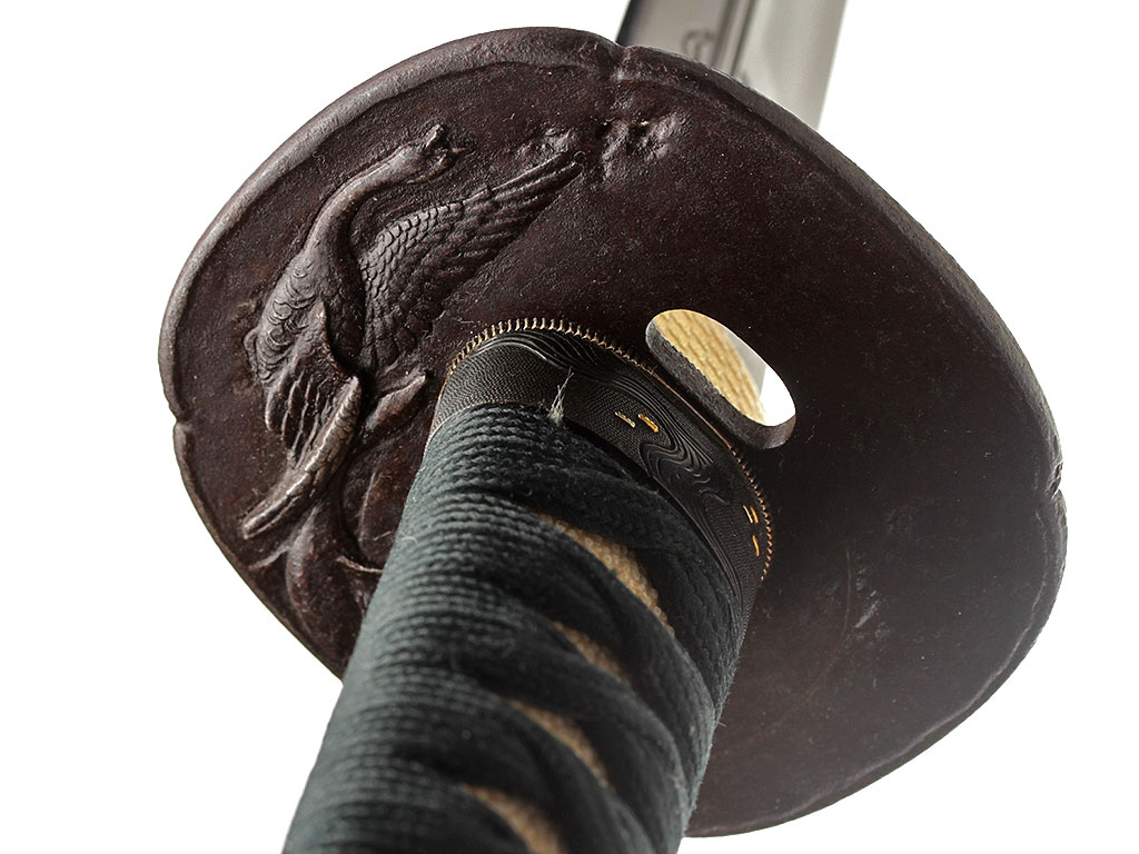 Гарда (цуба) овальной формы, состоящей как бы из четырех частей с округлыми долями (мокко-гата), выполнена из патинированного железа и имеет два отверстия для вспомогательных предметов, предусмотренных конструкцией ножен. Поверхность цубы с одной стороны украшена рельефным изображением летящих лебедей, а с другой стороны - гравированным изображением стеблей тростника.