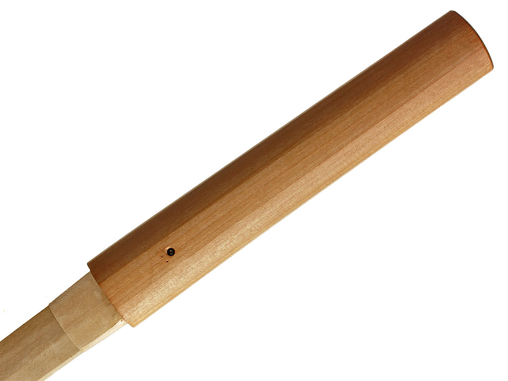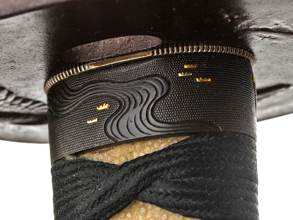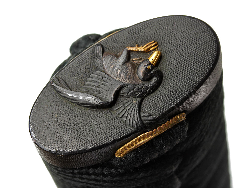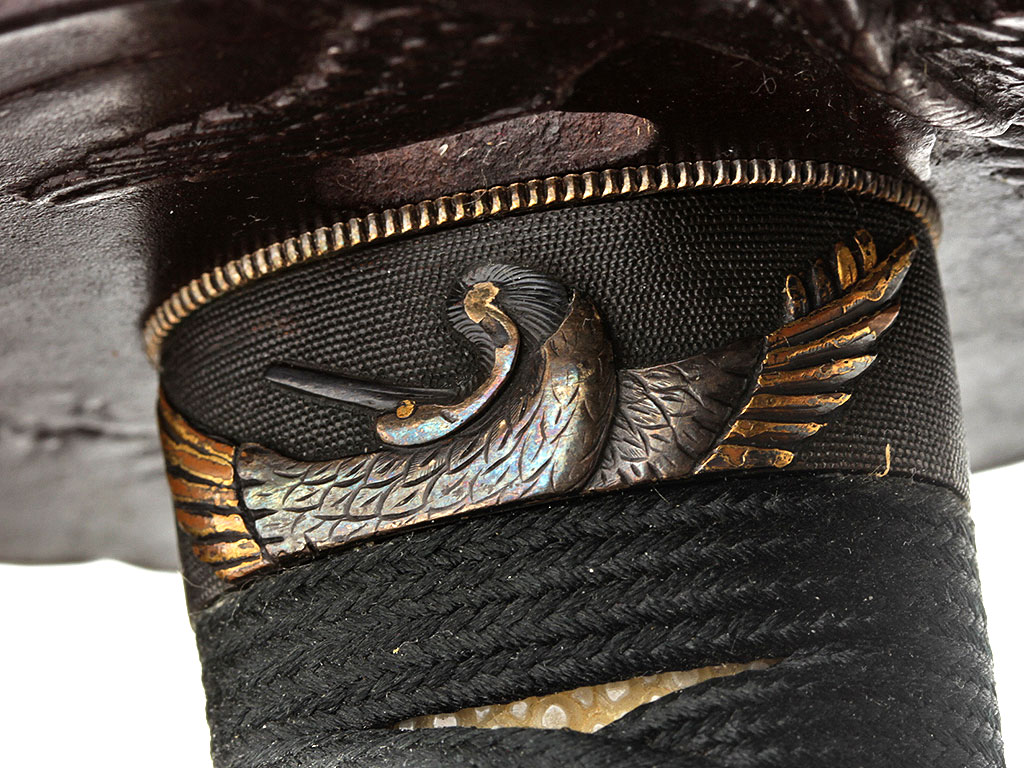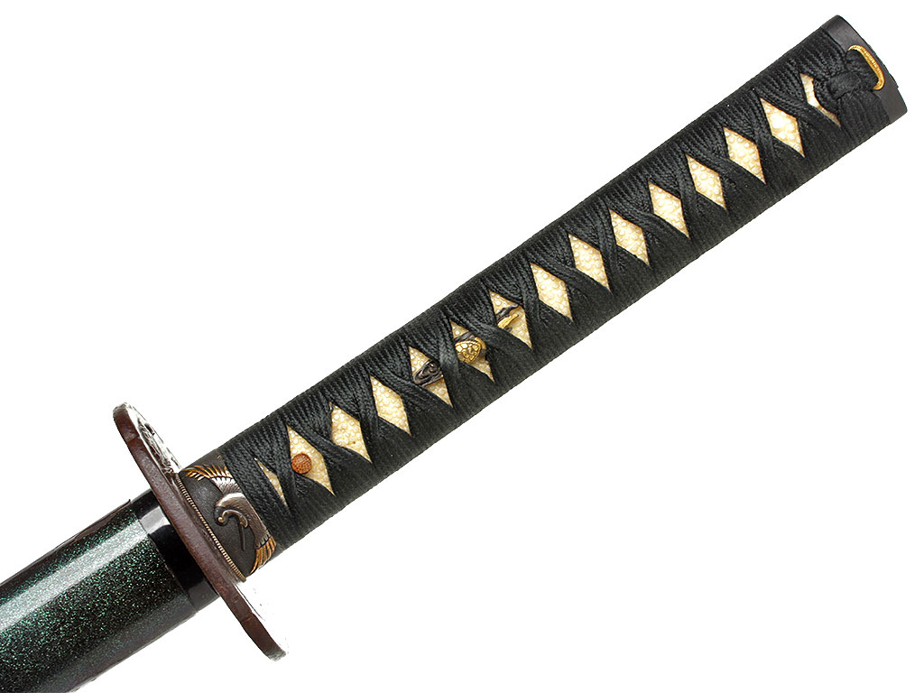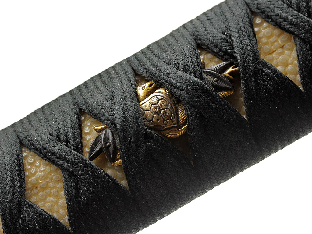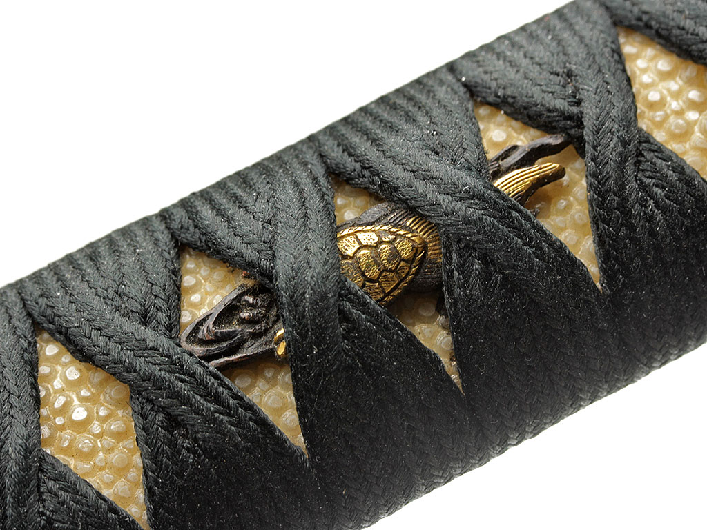 Рукоять (цука) образована двумя склеенными между собой деревянными частями с одним сквозным отверстием для колышка мэкуги. Покрыта шкурой ската или акулы (самэ) белого цвета. Поверх самэ в традиционном стиле наложена обмотка шелковым шнуром цука-ито темно-зеленого цвета. Под оплеткой рукояти с обеих сторон помещены изготовленные из патинированного и позолоченного цветного металла рельефные художественные накладки мэнуки. Обе накладки выполнены в виде фигурок черепахи, символизирующей долголетие. Рукоять увенчана чашеобразным навершием касира, а в ее основании находится муфта фути. Фути и касира изготовлены из сплава сякудо, представляют собой пару и украшены - фути изображениями журавля (также символ долголетия), а касира - спускающегося к земле дикого гуся.