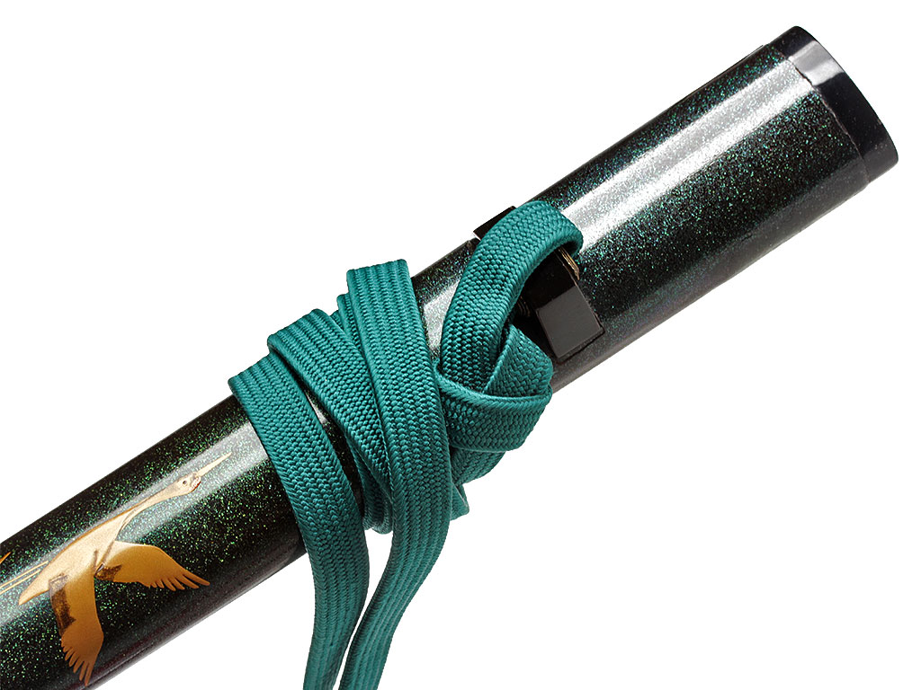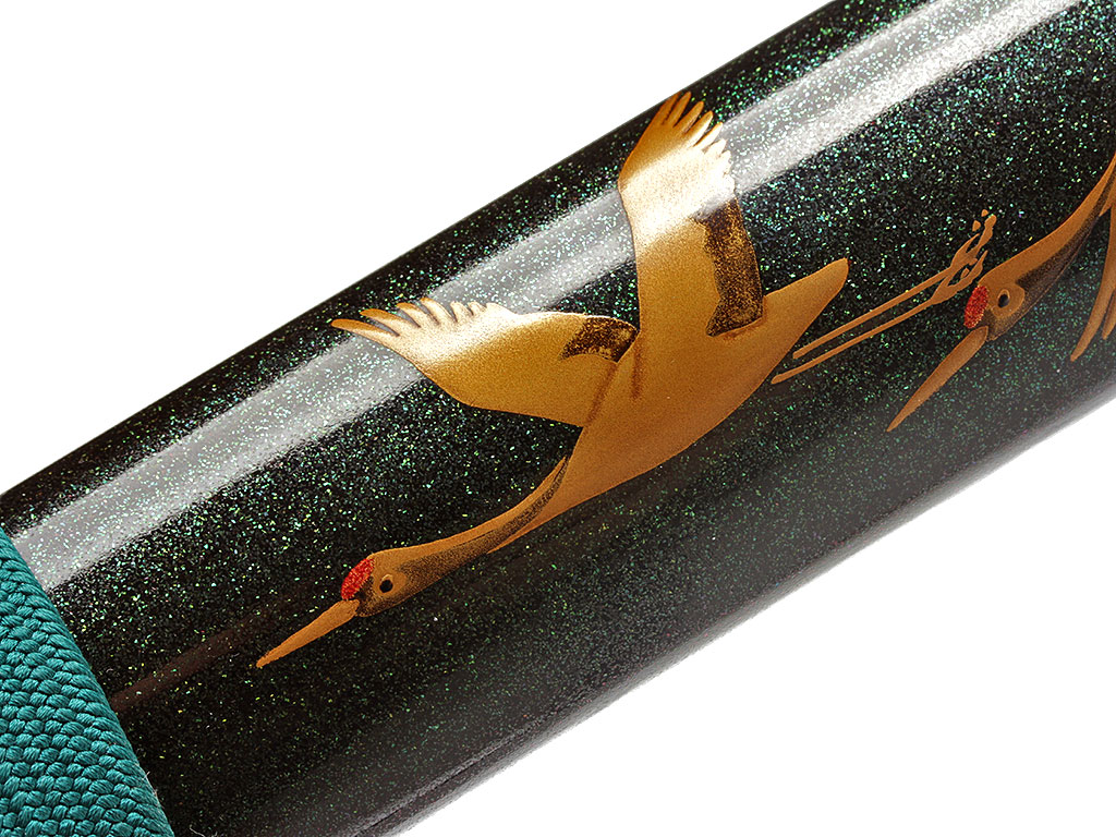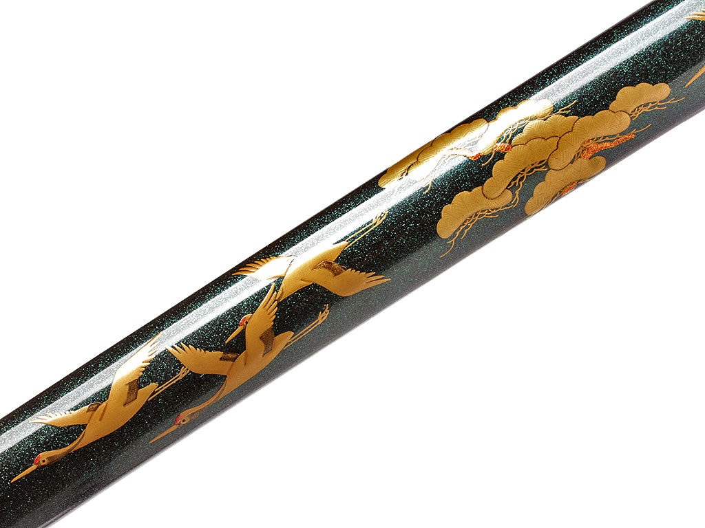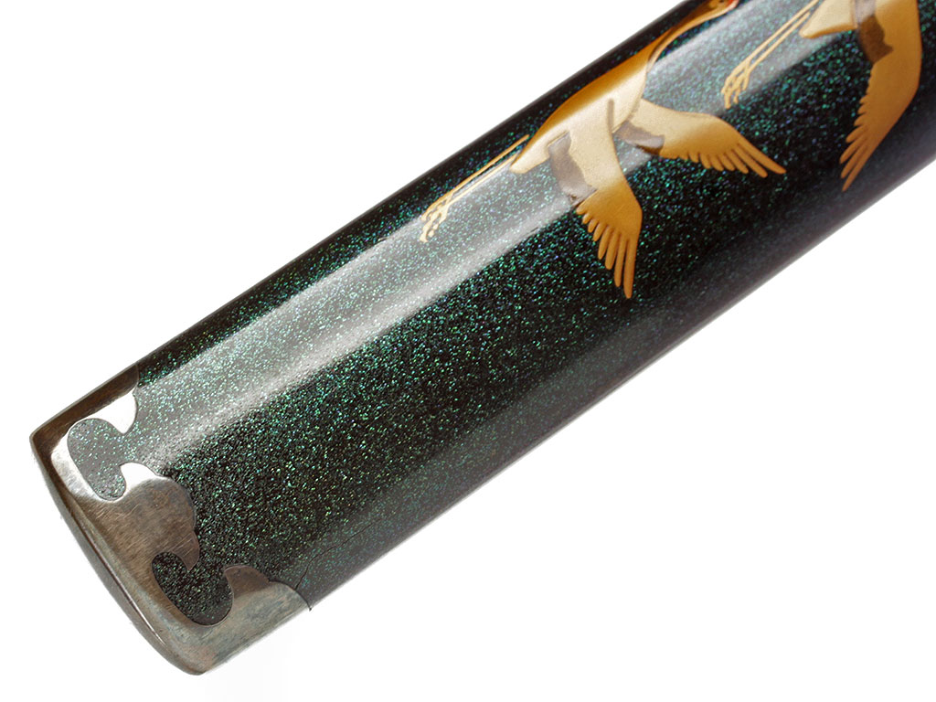 Ножны сая образованы двумя деревянными полосами, склеенными между собой. Покрыты в нижней части многослойным черным глянцевым лаком с зеленоватым отливом, в структуру которого добавлена мельчайшая фракция толченого перламутра. Поверх лака мастером, расписывавшим ножны, создана художественная композиция - стая летящих журавлей. С внешней стороны ножен расположен выступ куригата с прорезью для шнура сагэо. Ножны увенчаны подковообразным наконечником из полированного сплава меди и серебра.
