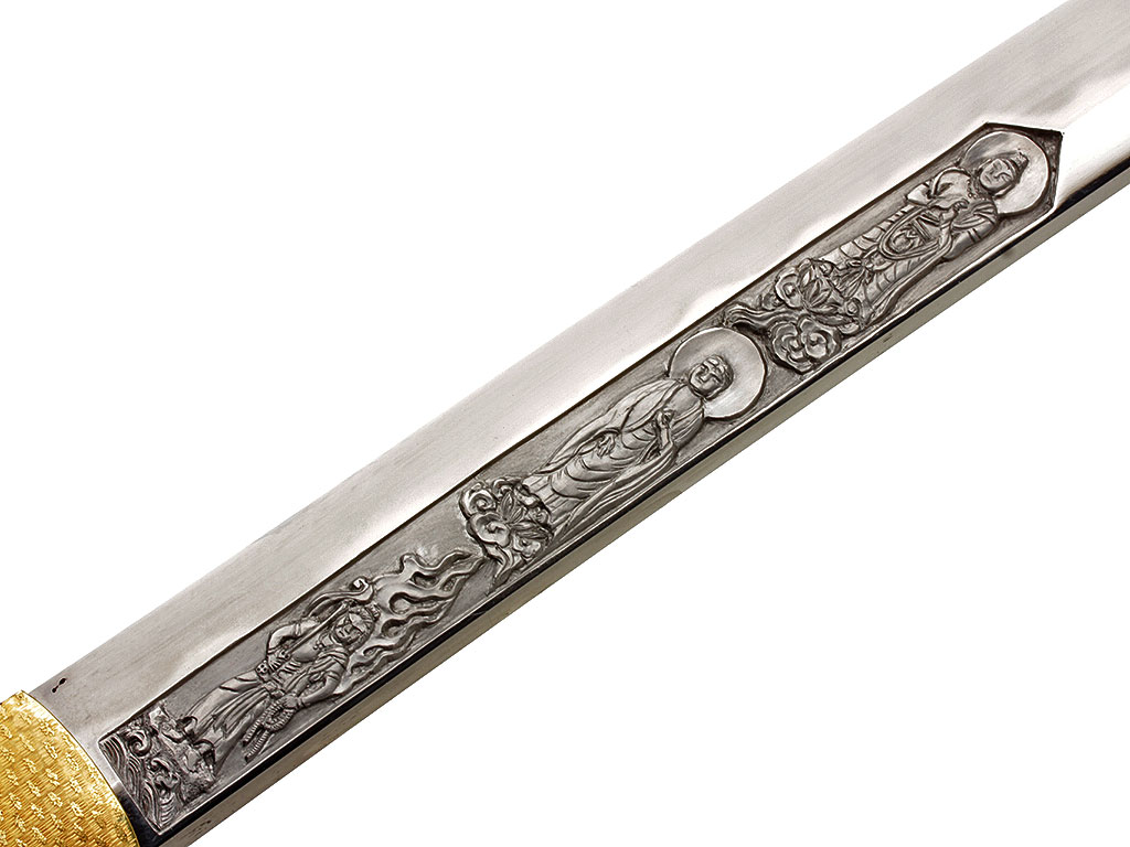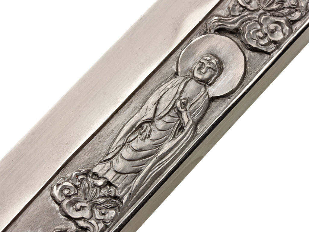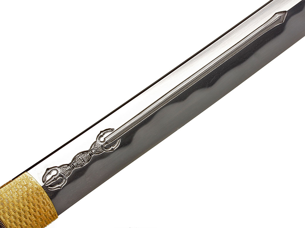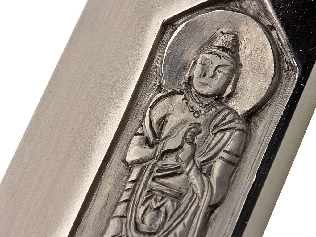 Конструкция клинка традиционная, с равномерным, слабо выраженным изгибом. С лицевой стороны в специально подготовленной нише рельефной художественной резьбой по металлу создано изображение трех божеств буддийского пантеона (хоримоно). С оборотной стороны клинка выгравирован прямой священный обоюдоострый меч. На всей протяженности клинка прослеживается широкая область закаленного края якиба и его узор хамон, демонстрирующий волнообразный узор. В основании клинок имеет выполненную из цветного металла позолоченную муфту хабаки, украшенную гравировкой в виде изображений пионов. Хвостовик клинка имеет два крепежных отверстия мэкуги-ана, которые предназначены для крепления клинка в рукояти с помощью деревянного колышка. Хвостовик с лицевой стороны имеет авторскую иероглифическую подпись кузнеца-изготовителя, нанесенную методом чеканки: "Ямато (но) Дайдзё Фудзивара Удзисигэ".