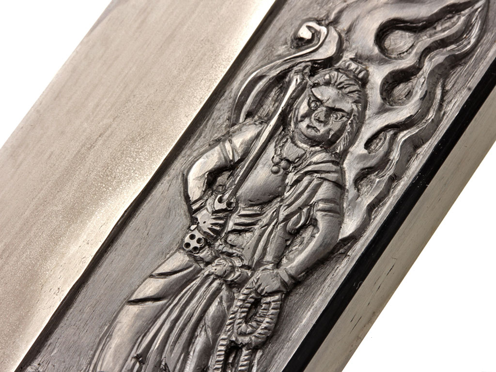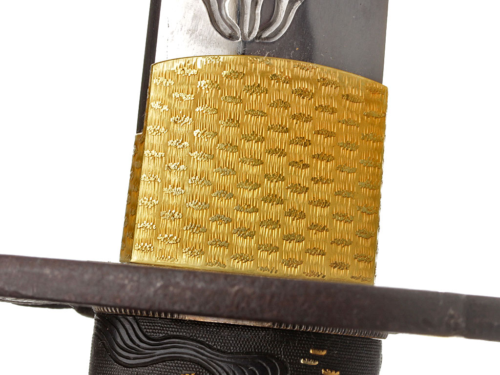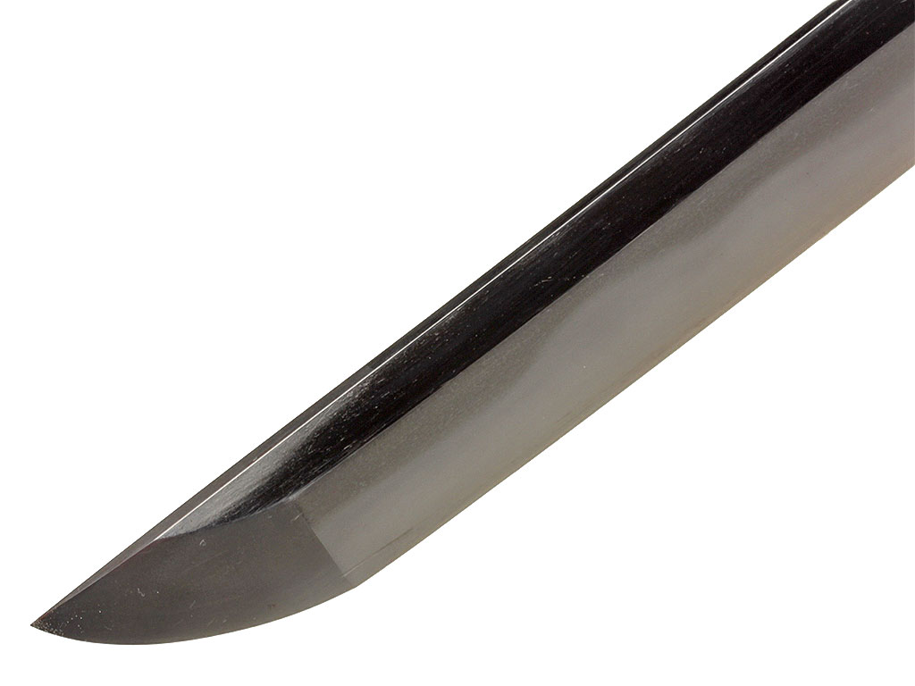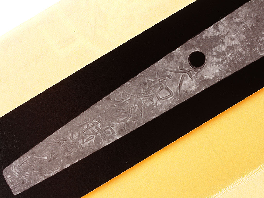 Конструкция клинка традиционная, с равномерным, слабо выраженным изгибом. С лицевой стороны в специально подготовленной нише рельефной художественной резьбой по металлу создано изображение трех божеств буддийского пантеона (хоримоно). С оборотной стороны клинка выгравирован прямой священный обоюдоострый меч. На всей протяженности клинка прослеживается широкая область закаленного края якиба и его узор хамон, демонстрирующий волнообразный узор. В основании клинок имеет выполненную из цветного металла позолоченную муфту хабаки, украшенную гравировкой в виде изображений пионов. Хвостовик клинка имеет два крепежных отверстия мэкуги-ана, которые предназначены для крепления клинка в рукояти с помощью деревянного колышка. Хвостовик с лицевой стороны имеет авторскую иероглифическую подпись кузнеца-изготовителя, нанесенную методом чеканки: "Ямато (но) Дайдзё Фудзивара Удзисигэ".