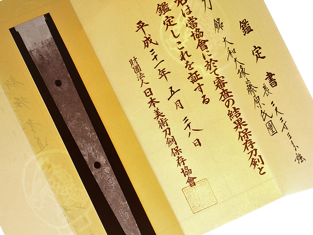 Клинок с экспертным заключением NBTHK и имеет статус "Оберегаемый меч" (Ходзон Токэн). Также имеется экспертное заключение за подписью А.В.Толстых. В комплект входит сира-сая для хранения клинка, а также чехол для хранения меча и оправы.
