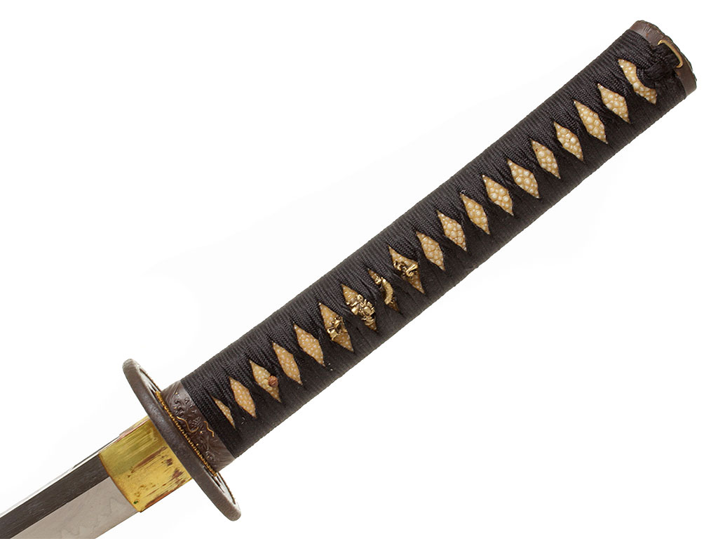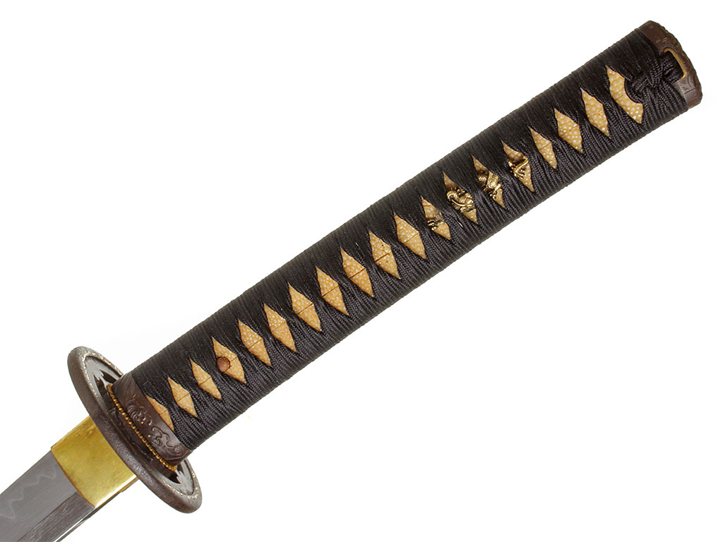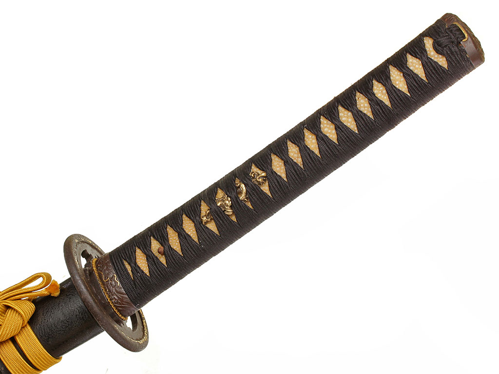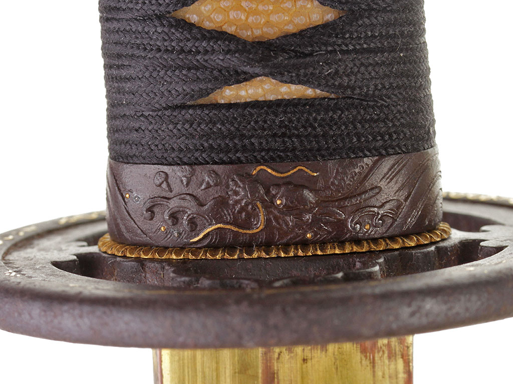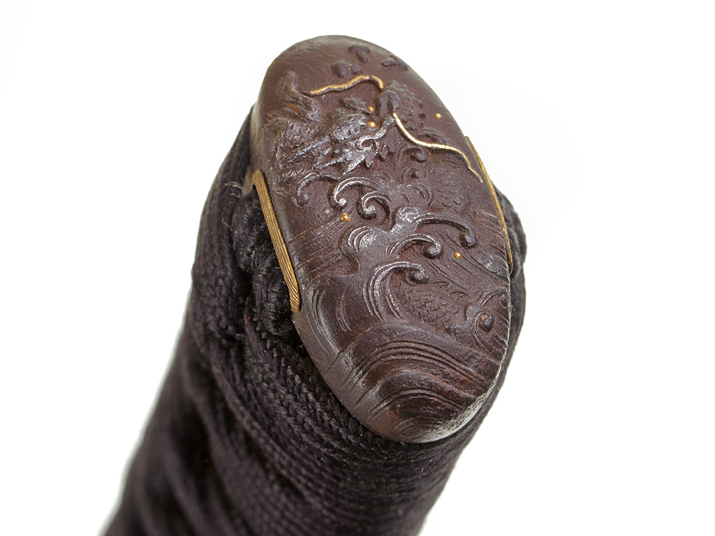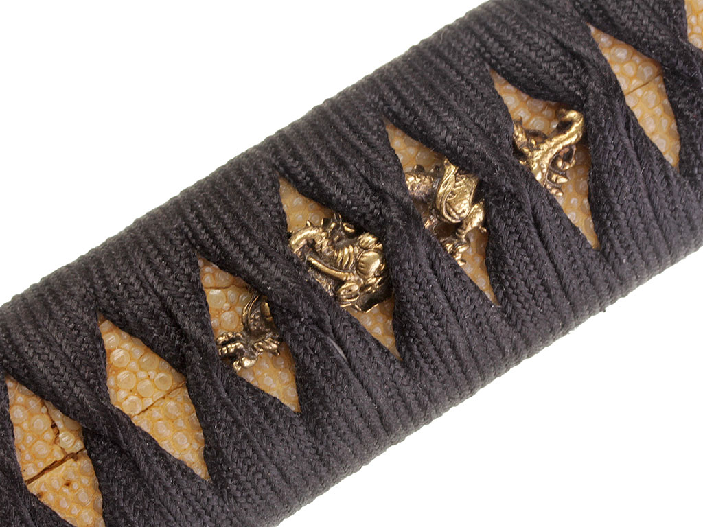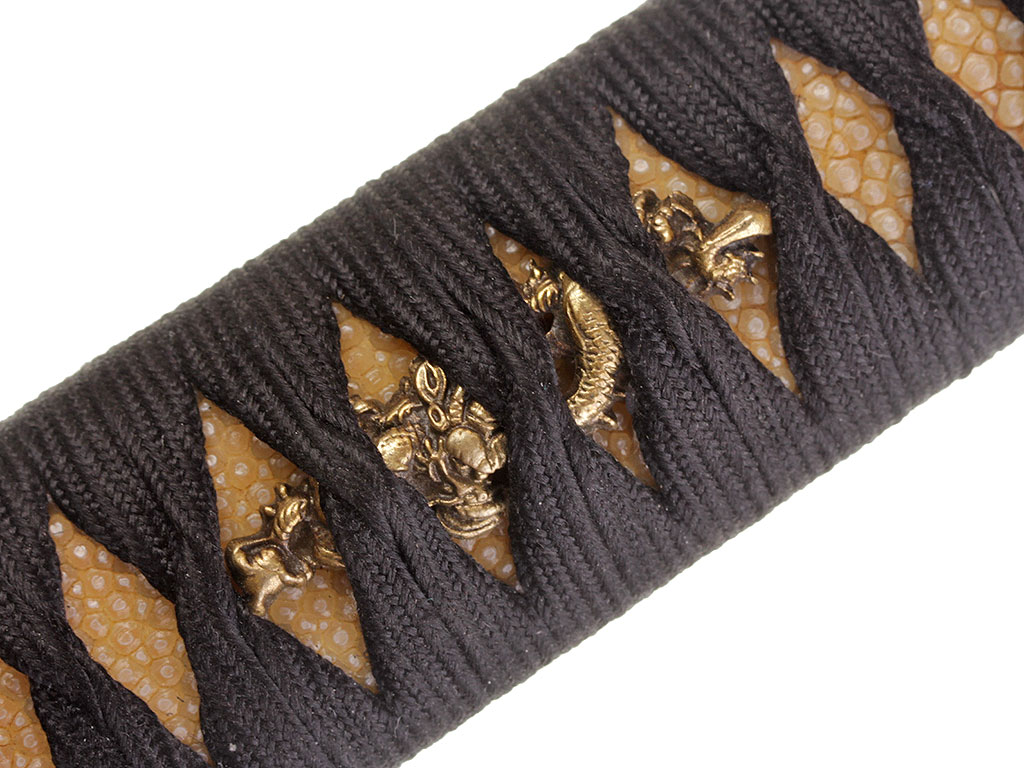 Рукоять (цука) образована двумя склеенными между собой деревянными частями с одним сквозным отверстием для колышка мэкуги. Покрыта шкурой ската или акулы (самэ) белого цвета. Поверх самэ в традиционном стиле наложена обмотка шелковым шнуром черного цвета. Под оплеткой рукояти с обеих сторон помещены изготовленные из патинированного и позолоченного цветного металла рельефные художественные накладки мэнуки. Обе накладки выполнены в виде фигурок драконов. Рукоять увенчана чашеобразным навершием касира, а в ее основании находится муфта фути. Фути и касира изготовлены из меди, представляют собой пару и украшены в едином стиле - рельефными изображениями драконов в волнах.