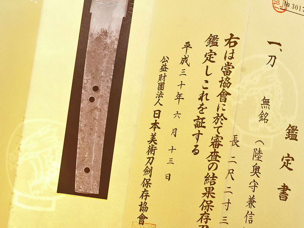 Клинок с экспертным заключением NBTHK и имеет статус "Оберегаемый меч" (Ходзон Токэн). Также имеется экспертное заключение за подписью Н.Л.Курсаниной. В комплект входит чехол для хранения меча и оправы.