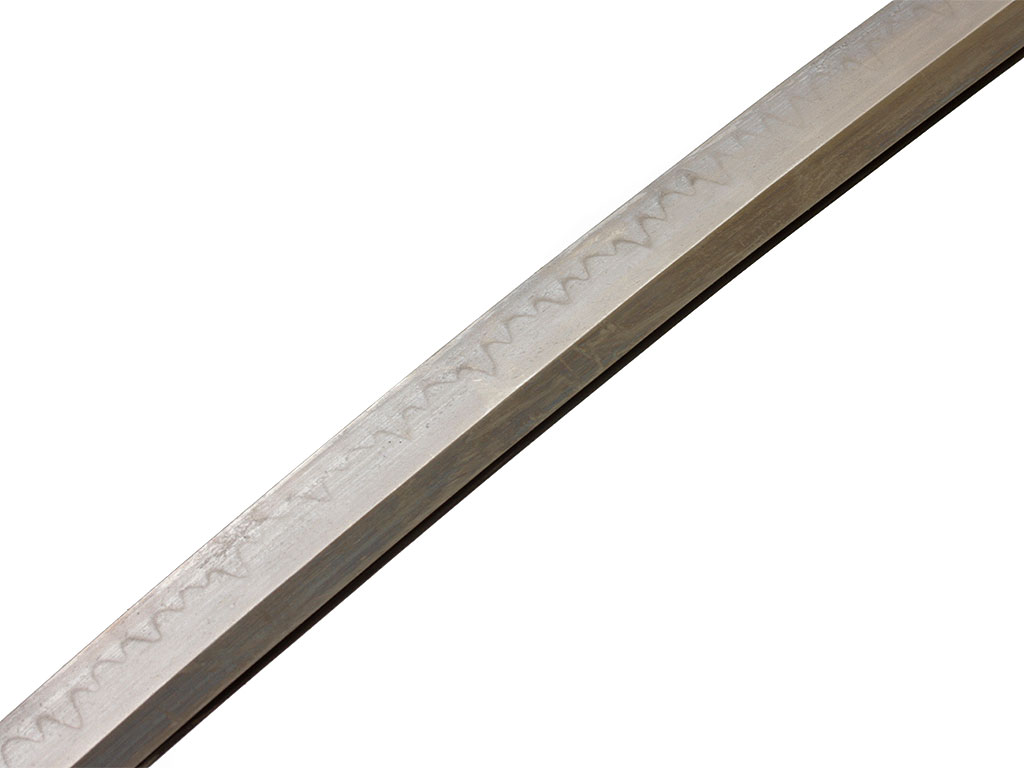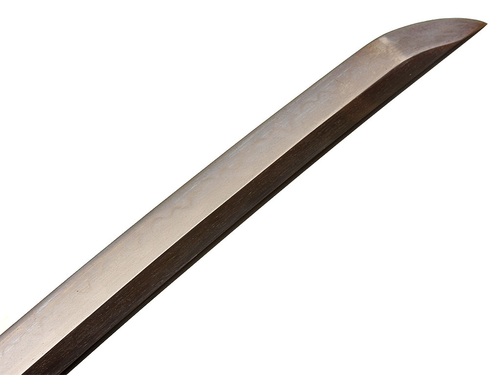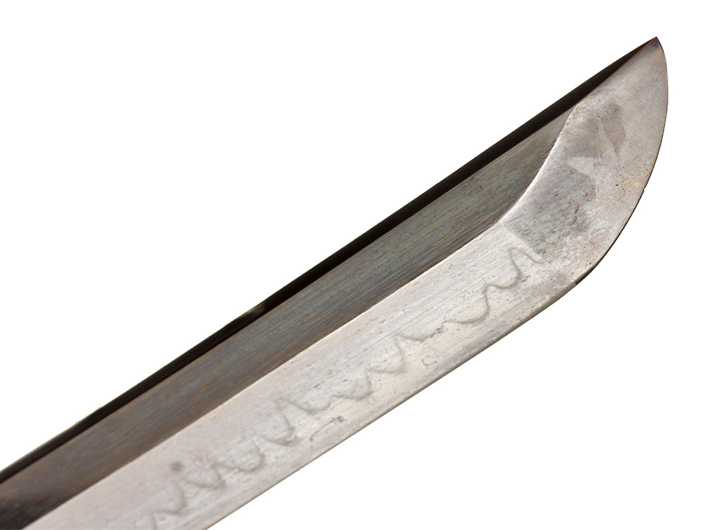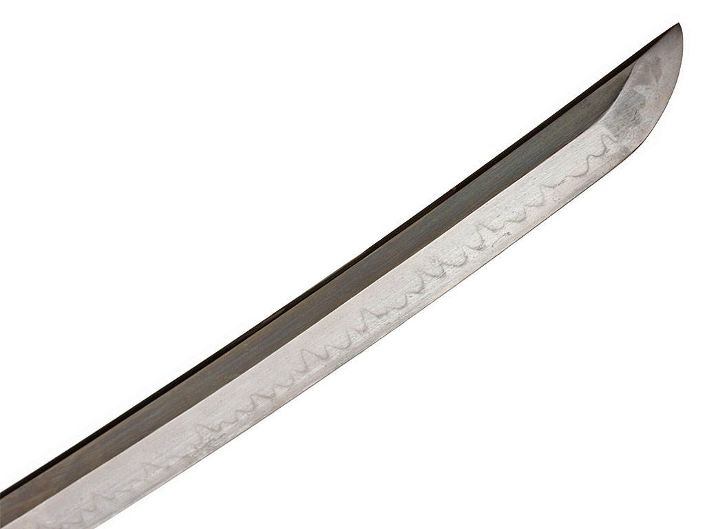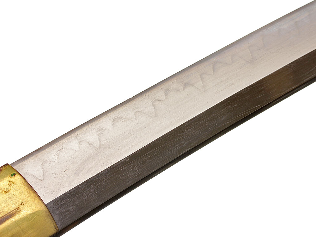 Конструкция клинка традиционная. Это однолезвийный клинок симметричного профиля с продольным ребром (синогидзукури), довольно широкий, со значительным изгибом вблизи хвостовика и малой вершиной (ко-киссаки). На всей протяженности клинка прослеживается широкая область закаленного края якиба и его узор хамон, демонстрирующий прекрасную четкую линию, состоящую из чередований высоких и низких волн. В основании клинок имеет выполненную из цветного металла (меди) позолоченную муфту хабаки с ровной гладкой поверхностью. Хвостовик клинка был ровно подрезан (укорочен) в процессе бытования и имеет три крепежных разновременных отверстия мэкуги-ана, одно из которых функционально и предназначено для крепления клинка в рукояти с помощью деревянного колышка. Подпись мастера, скорее всего, была обрезана при укорачивании клинка.