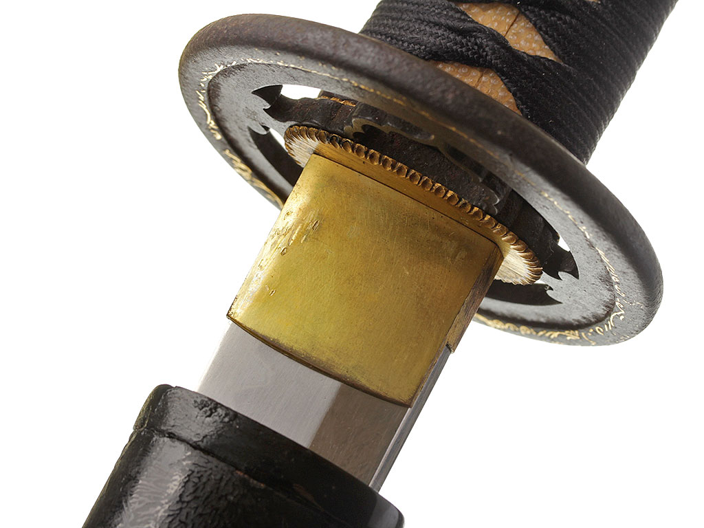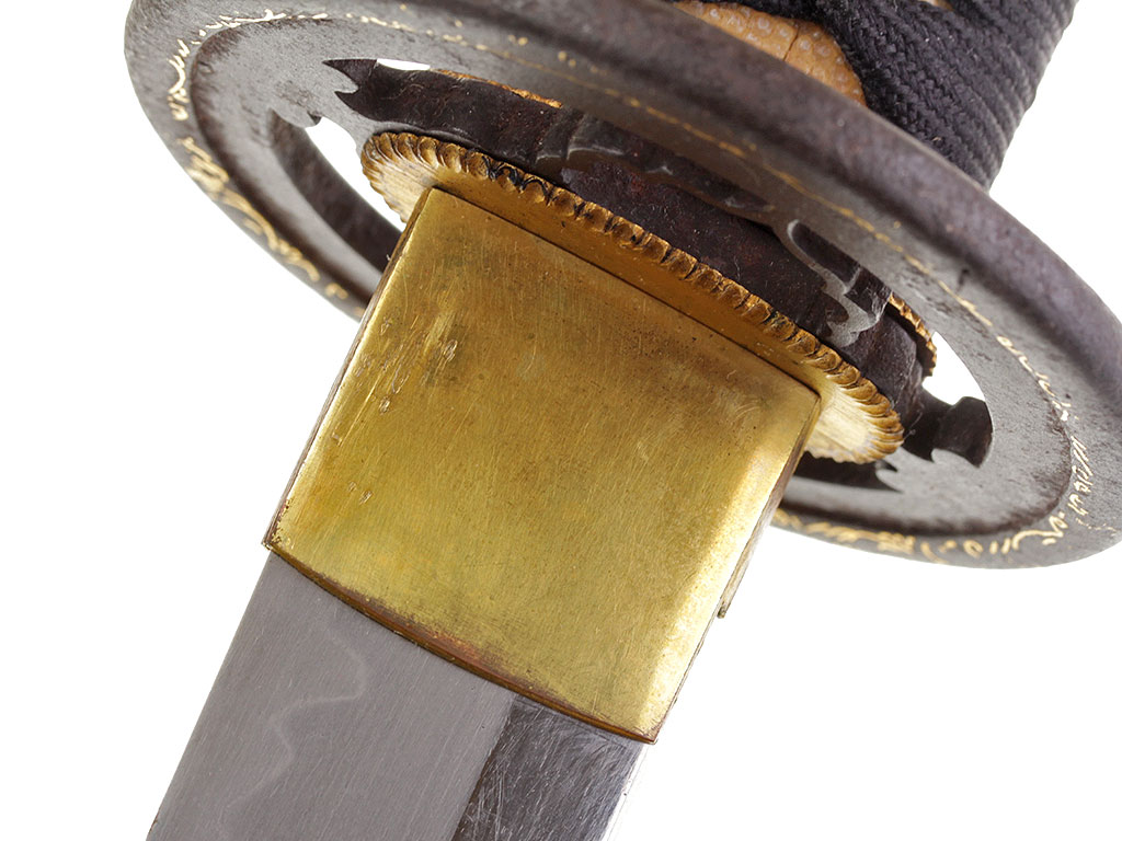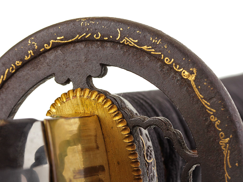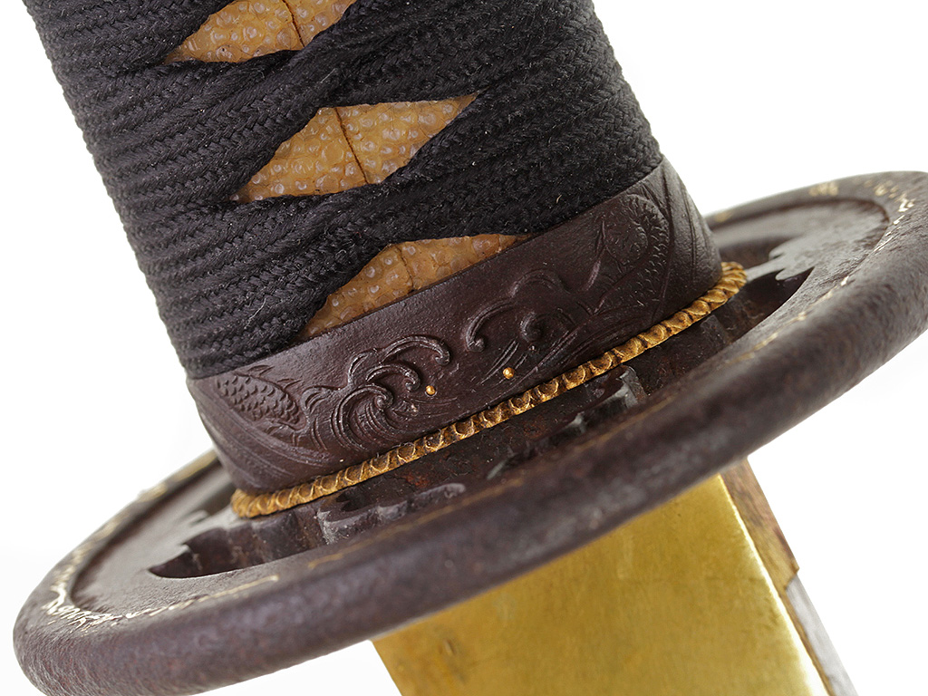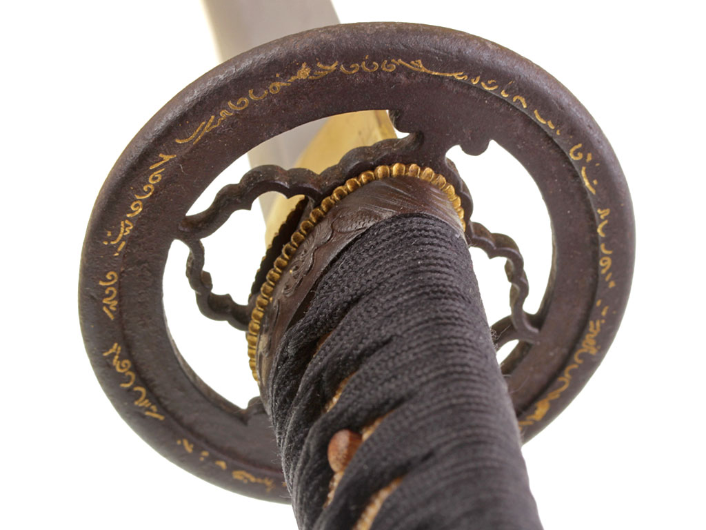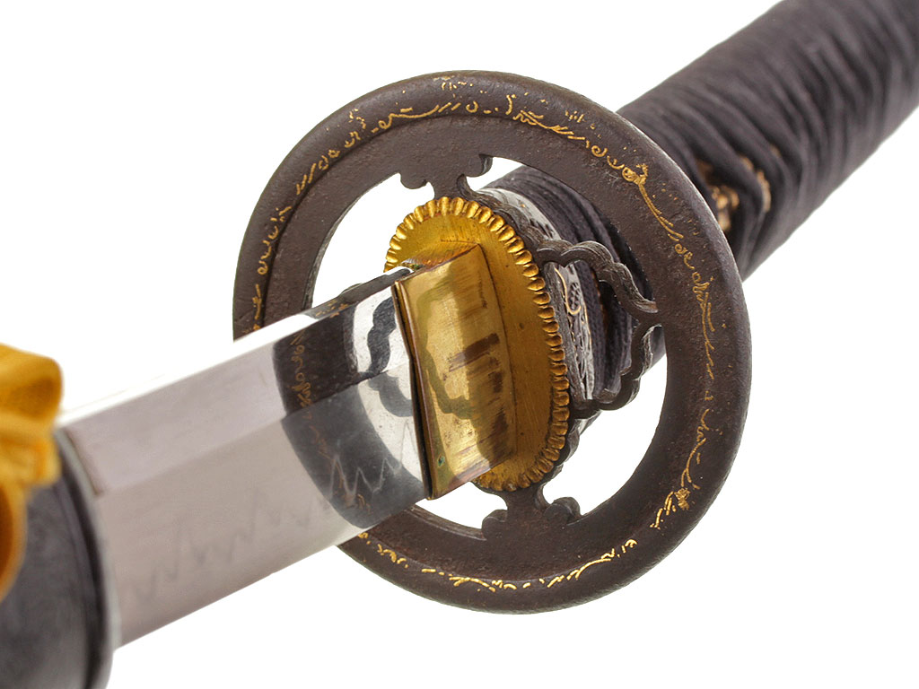 Гарда (цуба) круглой формы, выполнена из железа и имеет два отверстия для вспомогательных предметов (когаи и кодзуки). По выступающему краю цубы идет золотая инкрустация, представляющая собой затертую в процессе бытования иероглифическую надпись. Редкий случай, когда цубу возможно датировать тем же временем, когда изготовлен сам клинок.