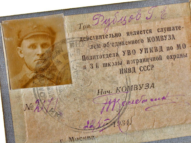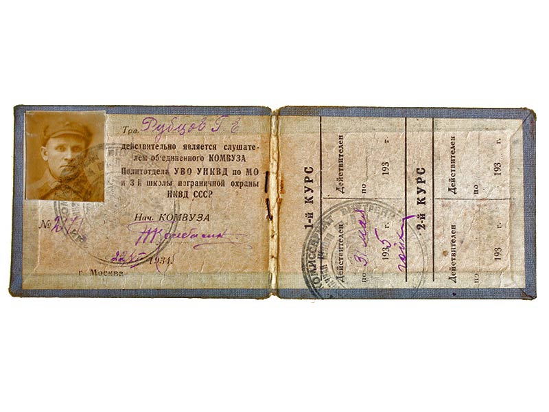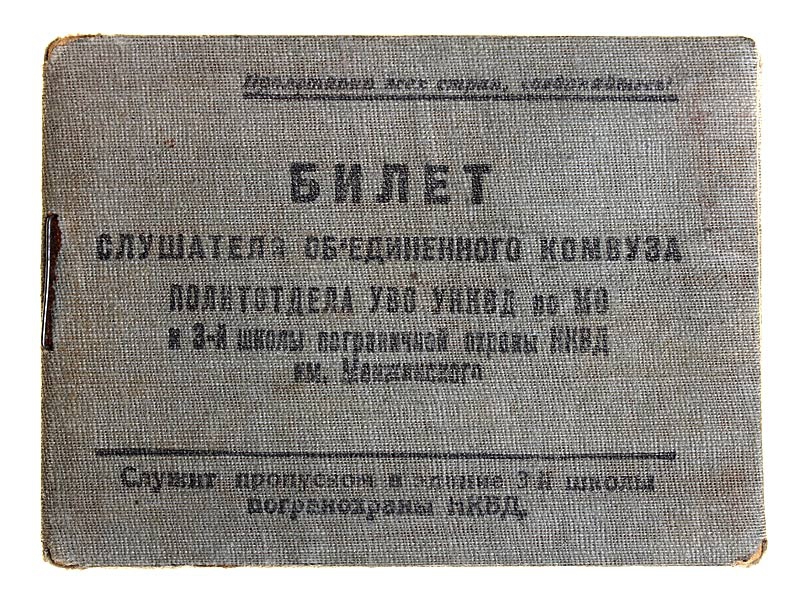 Билет слушателя объединенного комвуза (командирского высшего учебного заведения) политотдела УВО УНКВД по Московской области и 3-й школы пограничной охраны НКВД имени Менжинского. Удостоверение выдано 22 декабря 1934 года, с фото владельца.